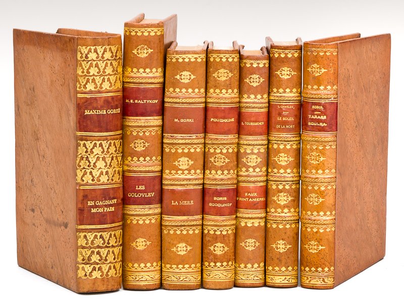 7 vol. in-8 ou in-12 reliure pleine basane racinée, dos à 4 nerfs orné (1 dos lisse orné), Saltykov-Chtchedrine : Les Golovlev, NRF, Gallimard, 1949 [Avec : ] Nicolas Gogol : Tarass Boulba, Editions Pierre Ardent, 1945 [Avec : ] Maxime Gorki : En gagnant mon Pain. Mémoires autobiographiques, Calmann-Lévy, 1924, traduit d'après le manuscrit de Serge Persky [Avec : ] Maxime Gorki : La Mère, Editions Sociales Internationales, 1934 [Avec : ] Alexandre Pouchkine : Boris Godounof. La fontaine de Bakhtchisaraï. Les Tziganes. Rousslane et Lioudmila, Librairie Plon, 1937 [Avec : ] Ivan Tourgueniev : Eaux printanières, Corrêa, 1947 [Avec : ] Ivan Chmélov : Le Soleil de la Mort, Librairie Plon, 1929 Jolie série bien reliée réunissant ces 7 romans russes. Bon ensemble (ex-libris ms.)
