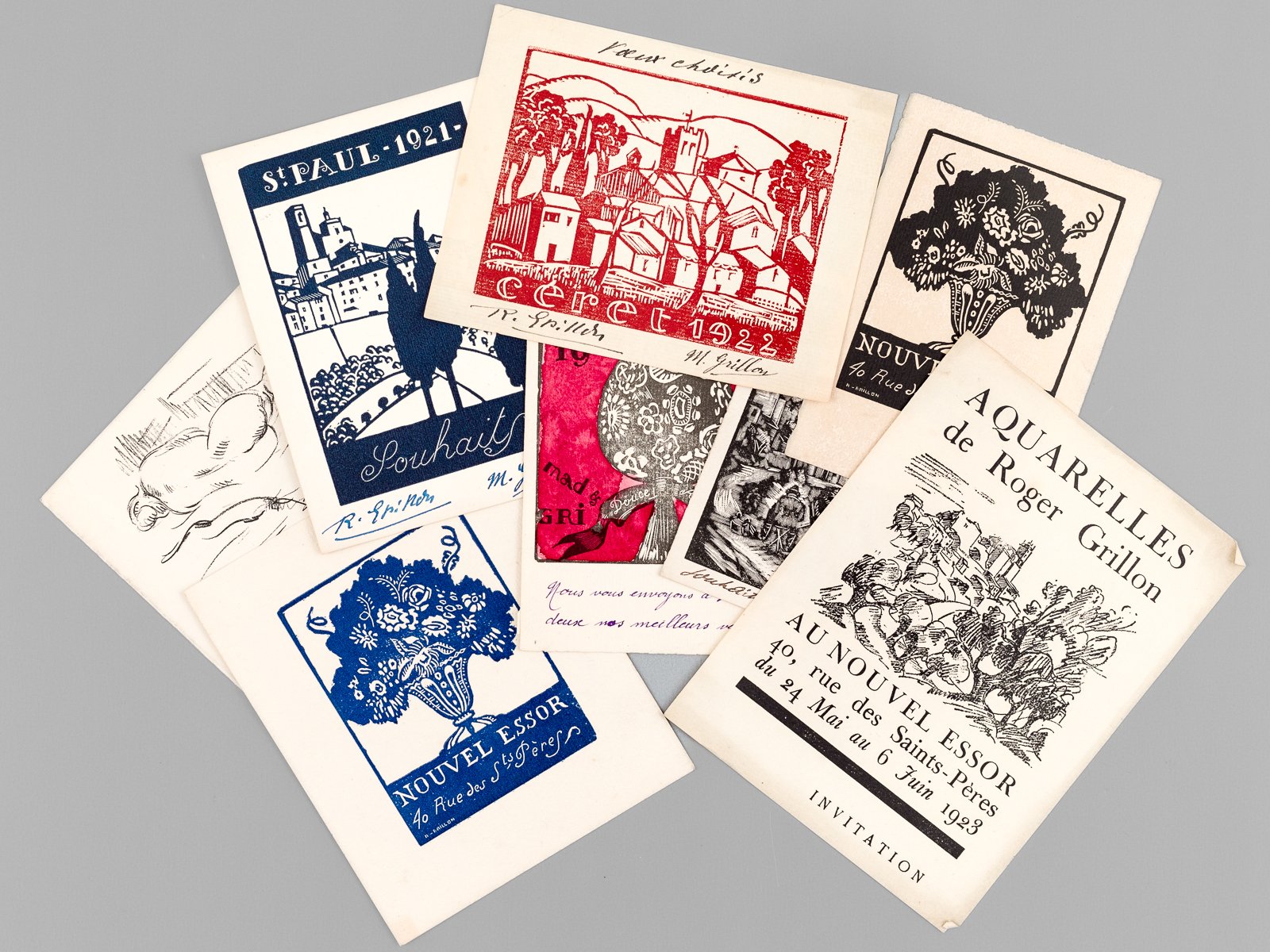 [ Lot de 9 gravures et invitations :] St Paul 1921 Souhaits - Céret 1922 - Mad & Roger Grillon 1923 Douce année - 1925 - 1925 - Nouvel Essor 40 Rue des Sts Pères - Nouvel Essor 40 Rue des Sts Pères - Aquarelles de Roger Grillon Au Nouvel Essor 40 rue des Saints-Pères du 24 Mai au 6 Juin 1923. Invitation - Peintures de Roger Grillon. Galerie André Arbus 34, rue de Metz du 2 au 30 Avril