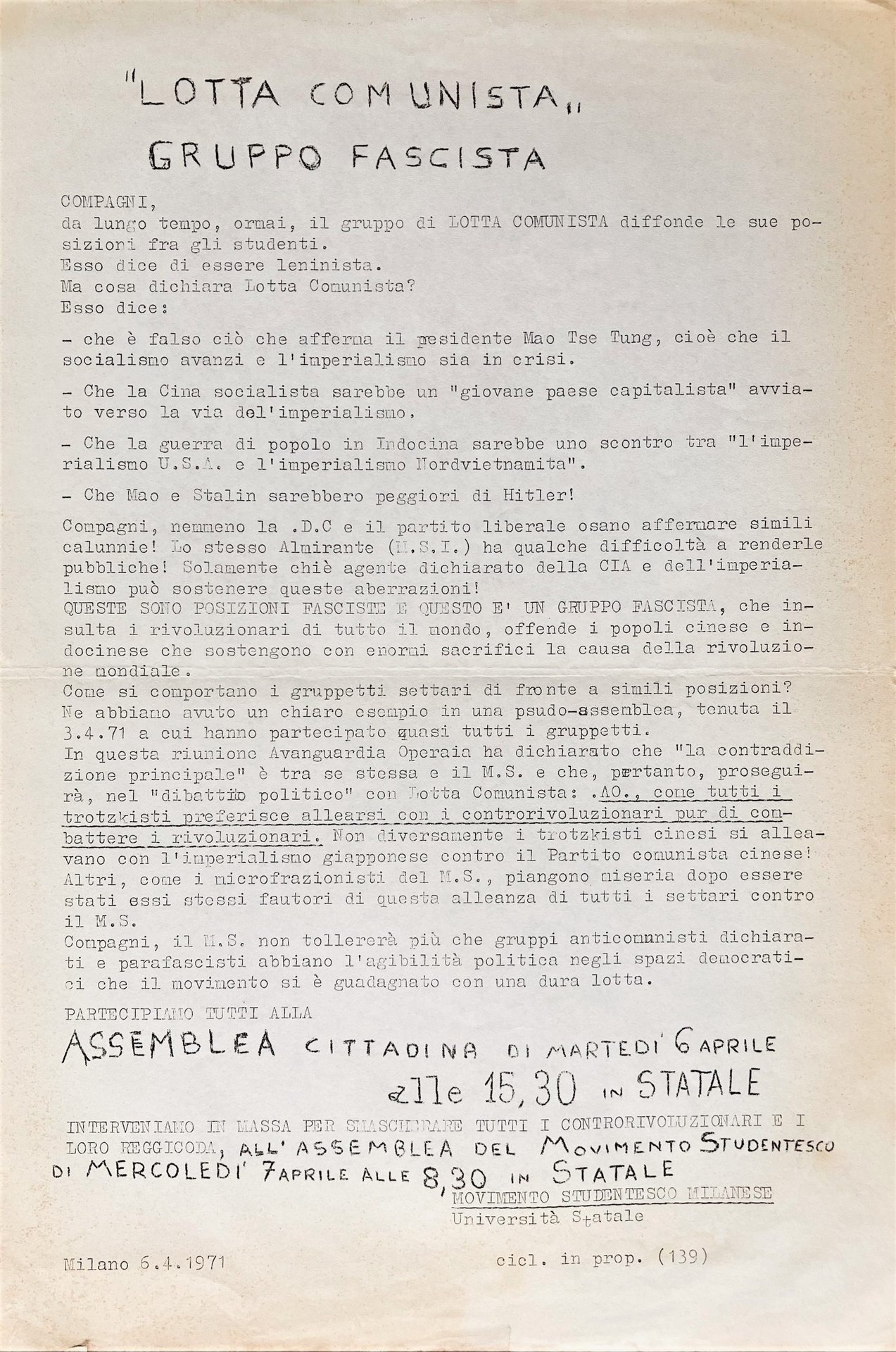Nemmeno la Dc e il Partito Liberale osano affermare simili calunnie!. Lotta Comunista si dichiara leninista ma accusa la Cina di essere un giovane paese capitalista sulla via dell'imperialismo e considera Mao e Stalin peggiori di Hitler. Volantino.