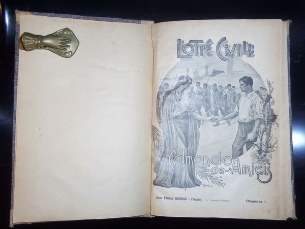 [Lotte civili De Amicis](cm25) Legatura mz tela, -pp. 256 varie illustrazioni a piena pagina, firmate da Faini, Manetti. Introduzione di Monticelli" Il socialismo, che Ë scienza, amore e arte, vibra e palpita in queste pagine del De Amicis.le questioni della patria, della famiglia, della religione, della propriet‡ trovano nelle Lotte civili il nuovo interprete. Leggano i giovani queste splendide pagine, in cui si appalesa vivo il conflitto tra le due classi sociali, la dominante e la dominata: tra chi ha tutto e chi non possiede nulla.scatuirsce un insegnamento solenne, il dovere che spetta alla giovent˘ di agire, di essere forte, onesta feconda di opere buone." Il volume Ë composto dalle 32 dispense stampate presso la tipografia Claudiana di Firenze e vendute in singole uscite a 5 cent cadauna, in seguito poi rilegate assieme. Ex libris GIGI TASSINARI alla sguardia libera. Segni del tempo e lievi mende su alcune pagine, che risultano stropicciate, ma difetto piuttosto comune per le uscite a dispense come queste. uno strappo a pagina 243, ma senza perdita con piena leggibilit‡ del testo. In buone condizioni complessive. [n49]