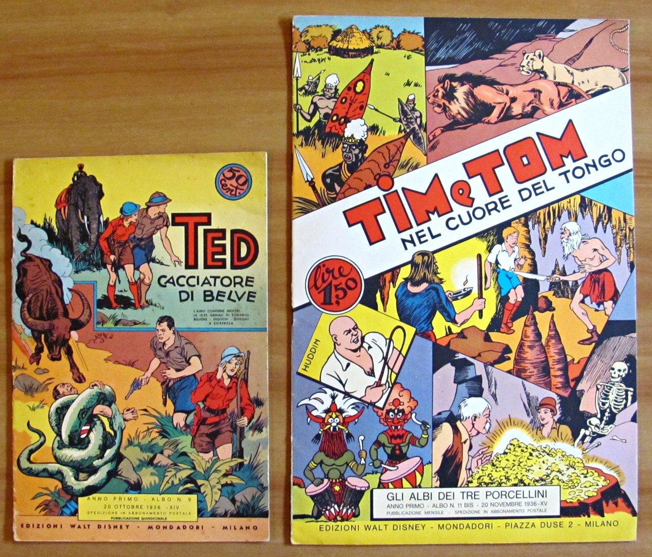 Gli albi dei tre porcellini. Anno Primo, Albo N.2 - Nel Paese dei Cupidini; Anno Primo, Albo N.4 - Gianni Giramondo; Anno Primo, Albo N.5 - Le aquile del Pacifico; Anno Primo, Albo N.6 - Piero Pat; Anno Primo, Albo N.7 - Chiave d'argento; Anno Primo, Albo N.7 bis - Tim e Tom nella Jungla africana; Anno Primo, Albo N.9 - Ted cacciatore di belve; Anno Primo, Albo N.11 bis - Tim e Tom nel cuore del Tongo; Anno Secondo, Albo N.16 - Ted Feller fra tigri e leoni; Anno Secondo, Albo N.20 - Ted e gli uomini leopardo. Edizione Anastatica Camillo Conti - Roma, 1980 Brossure editoriali. 26,5x39,5 oppure 20x28. Buonissimo/Ottimo stato. , Ottimo (Fine)