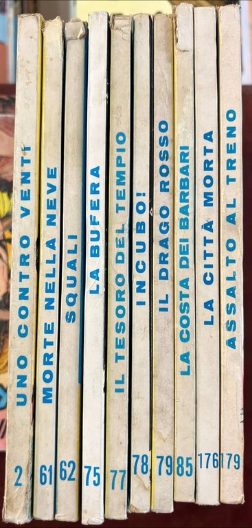 Lotto 10 numeri Tex (n° 2-61-62-75-77-78-79-85-176-179). Condizioni mediocri. Copertine e dorsi usurati, con macchie, strappi e segni d'uso. Tagli bruniti. Pagine ingiallite. paperback s.n. Mediocre (Poor) .