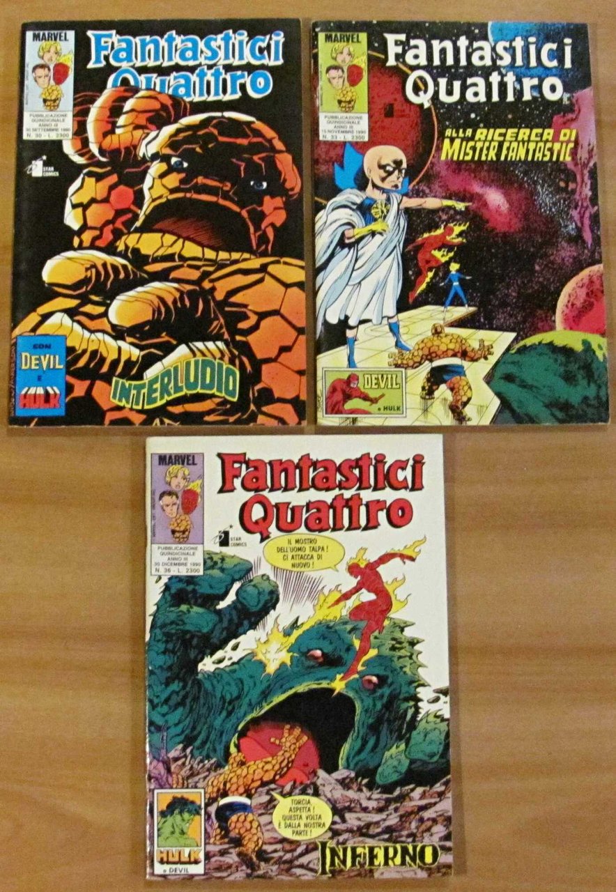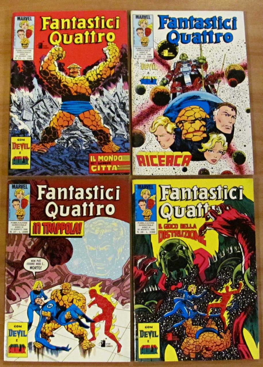 Lotto di 15 fumetti I Fantastici Quattro: N.5 - Febbraio 1989 - Missione per un uomo morto; N.7 - Aprile 1989 - Quattro contro; N.9 - Giugno 1989 - Dentro agli occhi; N.17 - Febbraio 1990 - Fine dell'infanzia; N.18 - Marzo 1990 - Destini incrociati; N.20 - Aprile 1990 - Incubo; N.22 - Maggio 1990 - Il fattore X; N.23 - 5 Giugno 1990 - Nella zona negativa; N.24 - 20 Giugno 1990 - Il mondo è una città; N.25 - 15 Luglio 1990 - Ricerca; N.27 - 15 Agosto 1990 - In trappola; N.28 - 30 Agosto 1990 - Il gioco della distruzione; N.30 - 30 Settembre 1990 - Interludio; N.33 - 15 Novembre 1990 - Alla ricerca di Mister Fantastic; N.36 - 30 Dicembre 1990 - Inferno. Ed. Marvel - Star Comics - Perugia, 1989/90. Brossure editoriali con lievissimi segni del tempo alle copertine. Interni freschissimi e puliti. 17x25. Buonissimo stato. , Molto buono (Very Good)