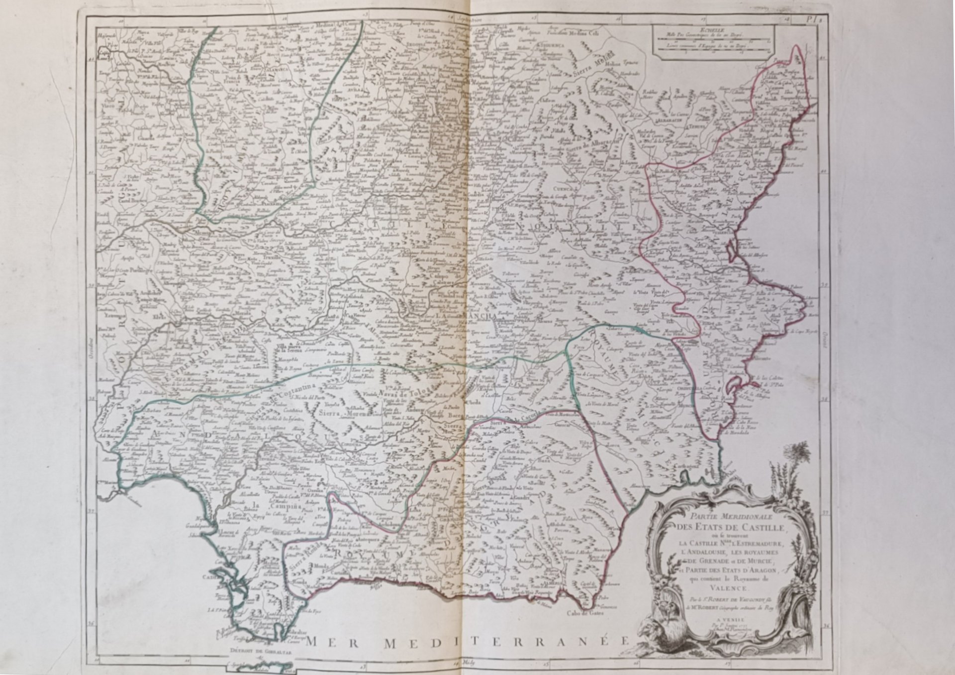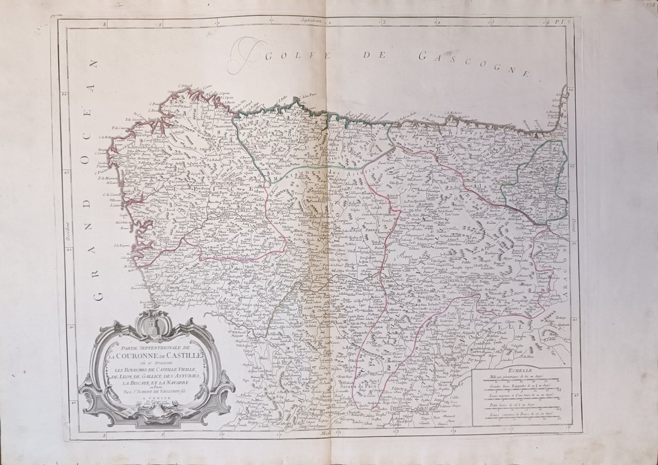 Lotto 2 stampe: PARTIE SEPTENTRIONALE DE LA COURONNE DE CASTILLE, OU SE TROUVENT LES ROYAUMES DE CASTILLE VIEILLE, DE LEON, DE GALLICE, DES ASTURIES, LA BISCAYE, ET LA NAVARRE. PARTIE MERIDIONALE DES ETATS DE CASTILLE, OU SE TROUVENT LA CASTILLE, L'ESTREMADURE, L'ANDALOUSIE, LES ROYAUMES DE GRENADE ET DE MURICE, ET PARTIE DES ETATS D'ARAGON