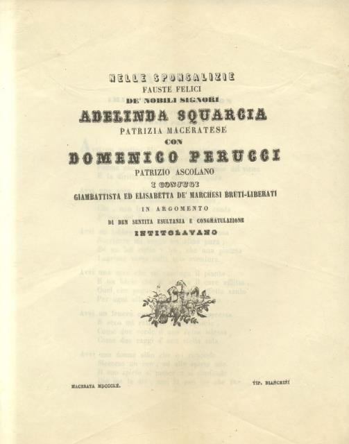 Lotto di 11 nuptialia originali per le nozze dei nobili Domenico Perucci di Ascoli e Adelinda Squarcia di Macerata.