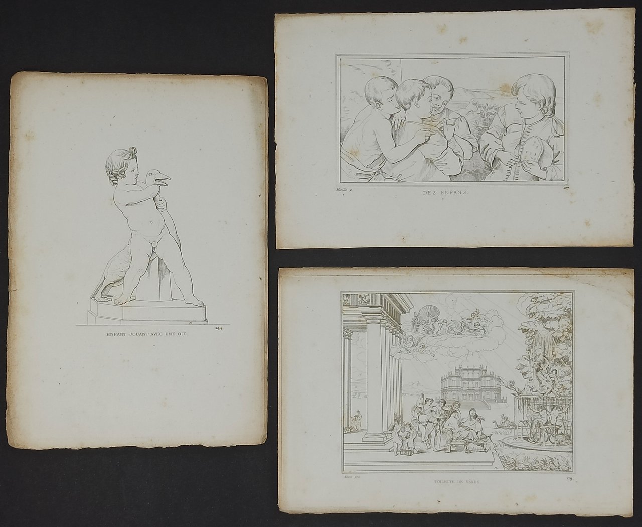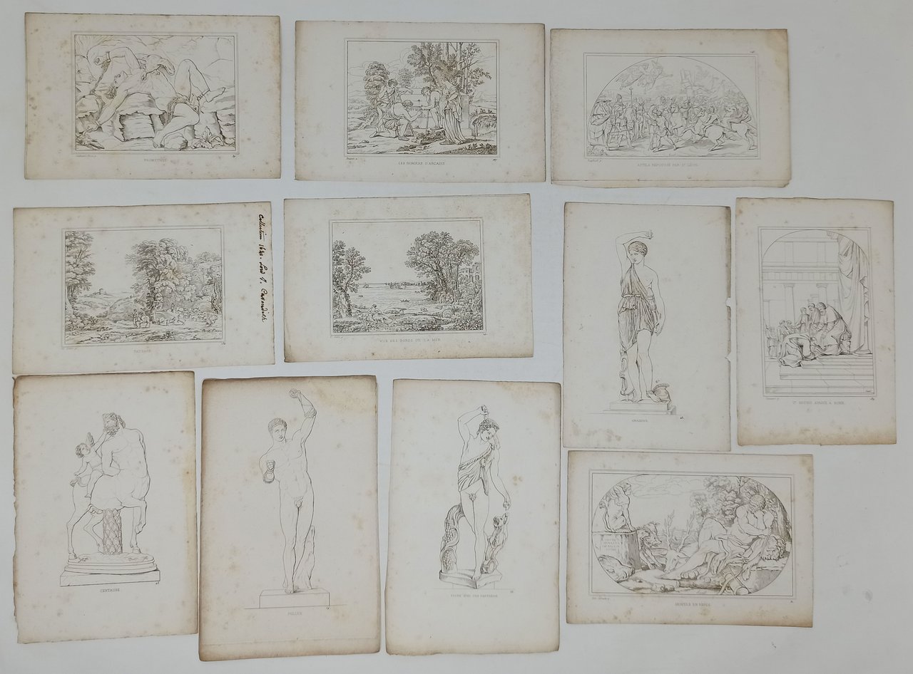 Lotto comprensivo di 188 stampe in nero originali, presumibilmente di diversa provenienza, tutte raffiguranti soggetti classici (prevalentemente religiosi e mitologici) ricavati da grandi autori quali Raffaello, Michelangelo, Rubens, Reni, Leonardo Da Vinci, . Stampate in Francia, non datate ma, presumibilmente, risalenti ai primi decenni dell'800. Dimensioni: 12 x 18 cm all'incirca. Stato di conservazione: Qualche inevitabile ossidazione della carta, alcune stampe presentano piccole mancanze o tagleitti sui margini, alcune presentano i margini un po' rifilati, due o tre stampe (in totale) presentano una scritta apenna sul margine bianco ma, nell'insieme, un lotto ben conservato; Si vedano le fotografie che fanno parte integrante della descrizione. Soggetti vari:; una quindicina di stampe sono dedicate a San Bruno,; 'Couronnement de Charlemagne' (Raphael),; 'La peste' (C. Procaccini),; 'Galilèe en prison',; 'La jurisprudence' (Raphael),; 'Proserpine aux enfers',; Pandore,; Apollo,; 'Danse des muses',; Centaure,; 'Gladiateur mourant',; 'Incendie de Borgo Vecchio' (Raphael),; 'Salomé fille d'Herodiade (Leonard de Vinci),; 'Paysage - scene d'effroi',; 'Paysage - Animaux près d'une ruine', 'Vue des bords de la mer',; St. Michel,; Bacco,; Promethée,; 'Les bergers d'Arcadie',; 'Massacre des innocens',; 'Victoire d'Ostie',; diverse stampe ritraggono la Santa Famiglia,; 'La nativité',; Ercole,; 'Diane et ses nymphes',; 'Le bapteme',; St. Marc,; Milon de Crotonne,; 'Salomon et la reine Saba',; Amazone,; 'Naissance de l'amour',; 'Abram recevant les trois anges', St. Madaleine,; St. Jérome,; St. Barthélemy,; 'Venus Victorieuse',; 'Marche de silène',; 'St. Antoine tourmente par le demon',; 'Fuite en Egypte',; 'Charles Ier',; 'Les lutteurs',; 'Le char de l'aurore' (Guido Reni),; .