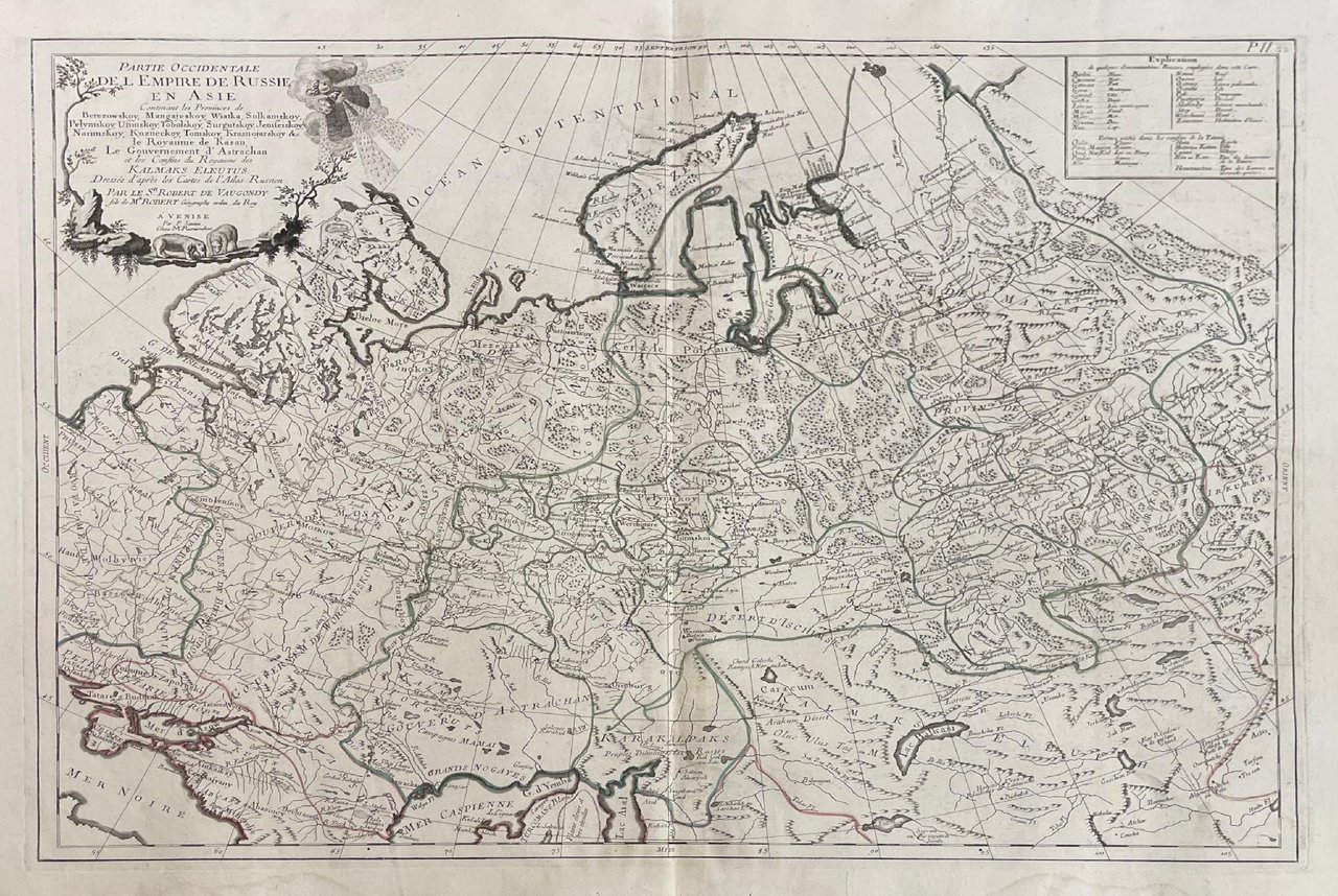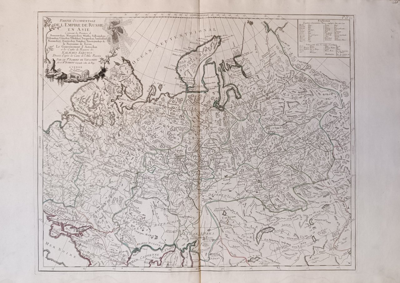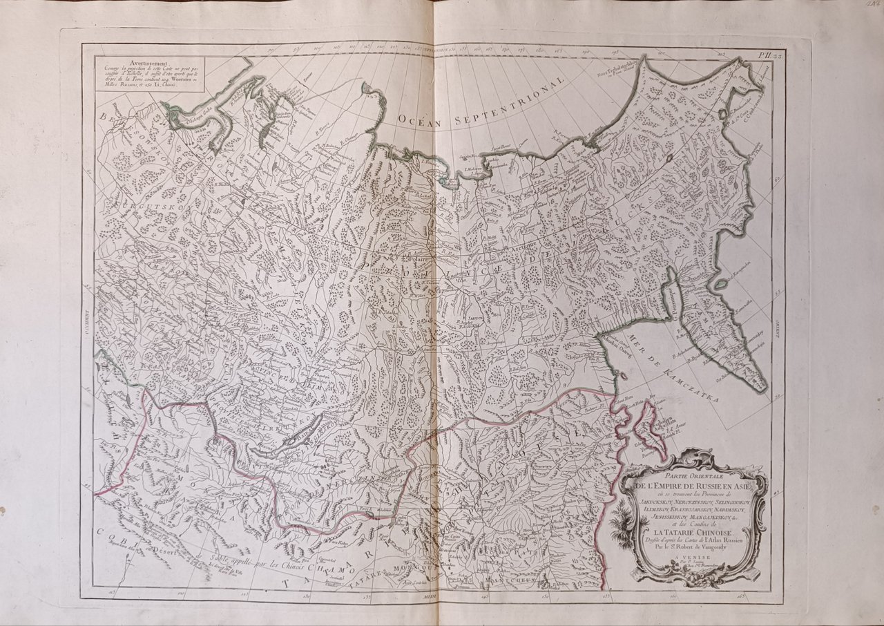 Lotto di due mappe dall' “Atlas Universel” stampato a Venezia nel 1776 e nel 1784, comprendente: - Parte occidentale de l'Empire de Russie en Asie contenant les Provinces de Berezowskoy, Mangajeskoy, Wiatka, Solkamskoy, Pelymskoy, Ufimskoy, Tobolskoy, Surgutskoy, Jenifeiskoy, Narimskoy, Kuzneckoy, Tomskoy, Krasnojarskoy &c., le Royaume de Kasan, le Gouvernement d'Astrachan. - Parte orientale de l'Empire de Russie en Asie où se trouvent les Provinces de Jakuckskoy, Nerckzinskoy, Selinginskoy, Ilimskoy, Krasnojarskoy, Narimskoy, Jenisseiskoy, Mangajeiskoy &c. et les confins de le Tatarie Chinoise.