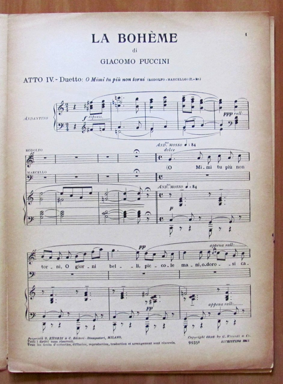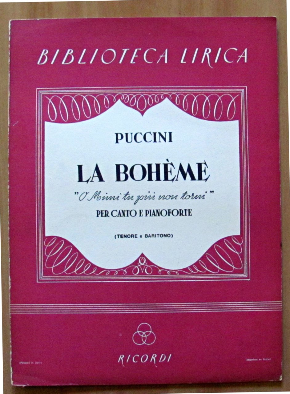 O Mimì tu più non torni (da La Bohéme), Pezzi Celebri di Opere Teatrali (Atto I, Canzone "Tra voi, belle brune" dalla Manon Lescaut), Sono andati? Fingerò di dormire (da La Bohéme), Amore o grillo (da Madama Butterfly). Ed. Ricordi - Milano, 1950-1951-1953. Brossure editoriali. 24x32. BUONISSIMO STATO , Ottimo (Fine)