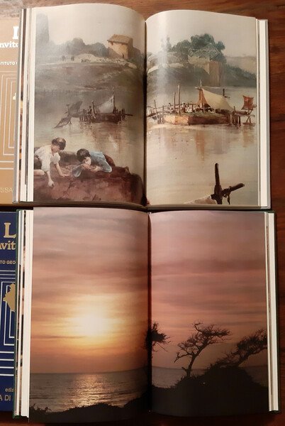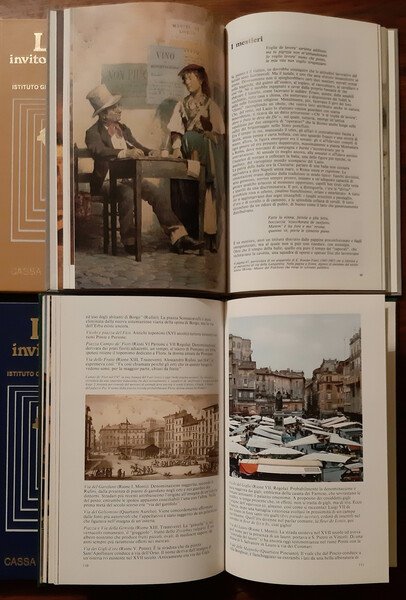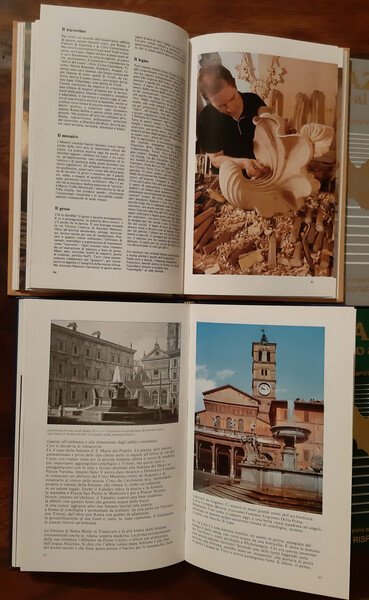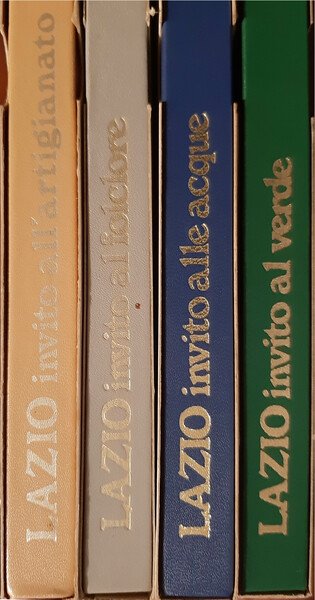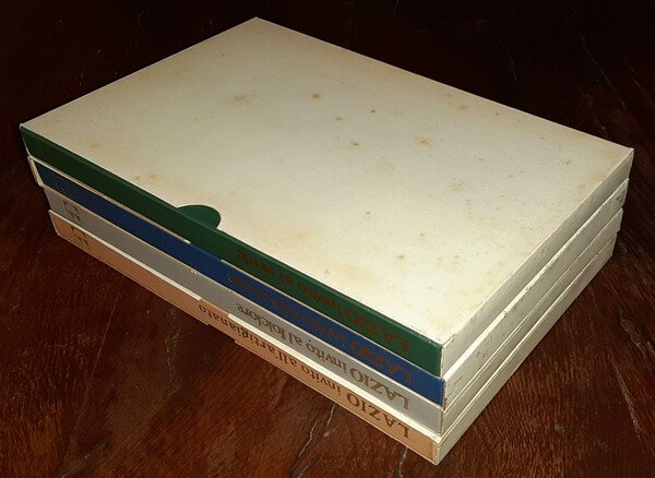 Lotto di 4 volumi sul Lazio in edizione speciale per la Cassa di Risparmio di Roma, pubblicati annualmente tra il 1981 e il 1984; dim. circa 270x175 mm, leg. rigida editoriale in similpelle con decori e titoli impressi in oro, custodia in cartone. Il lotto comprende: 1.: Lazio: invito alle acque. Novara, De Agostini, 1981 [Rif.: IT\ICCU\SBL\0302288]. 2.: Lazio: invito al verde. Novara, De Agostini, 1982 [Rif.: IT\ICCU\RMS\0127453]. 3.: Lazio: invito all'artigianato. Novara, De Agostini, 1983 [Rif.: IT\ICCU\MOD\0383511]. 4.: Lazio: invito al folclore. Novara, De Agostini, 1984 [Rif.: IT\ICCU\LO1\0508593]. Cond.: Lieve presenza di foxing ai cartoni delle custodie, ma in generale esemplari in condizioni quasi ottime.