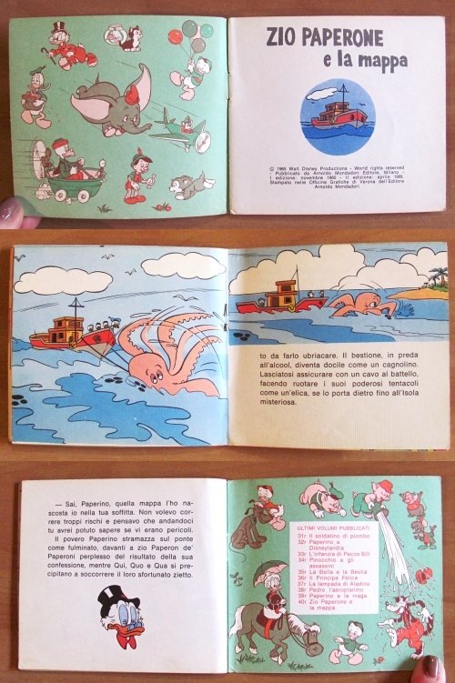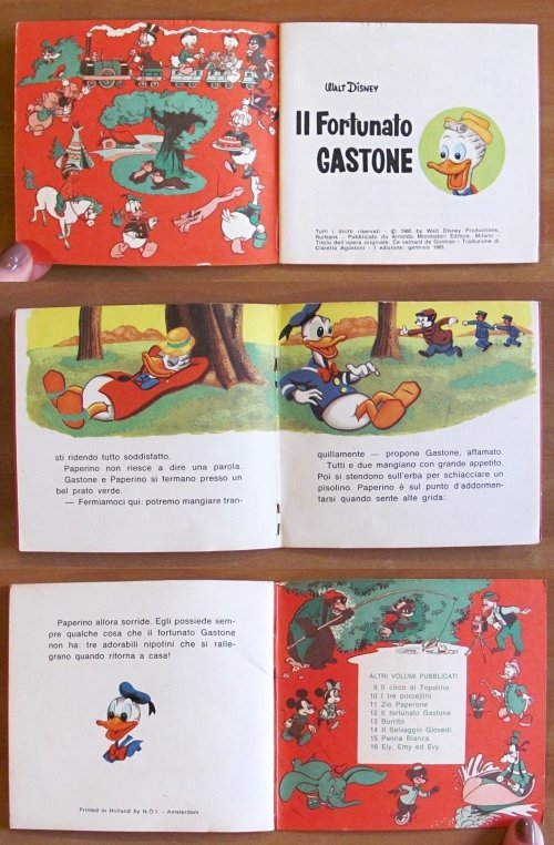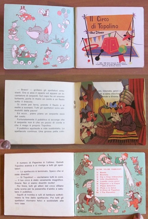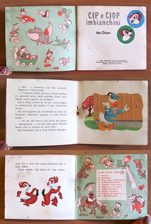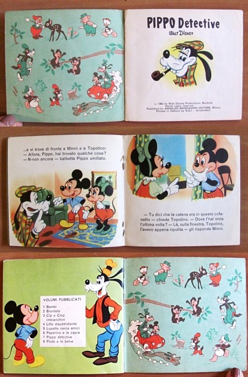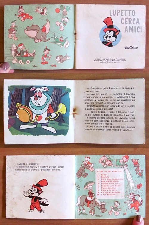 Lotto di 6 Albi. N.3 - Cip e Ciop Imbianchini (1968), N.5 - Lupetto cerca amici (1968), N.7 - Pippo Detective (1962), N.9 - Il Circo di Topolino (1968), N.12 - Il Fortunato Gastone (1965), N.40 - Zio Paperone e la mappa (1965). Ed. Mondadori - Verona. Brossure editoriali con minime imperfezioni del tempo al dorso dei N.7 e 12. Peraltro tutti in Ottimo stato, tranne il N.9 che presenta una mancanza alla pagina centrale (come da foto). 11x10. Tutti in OTTIMO/BUONISSIMO STATO , Molto buono (Very Good)