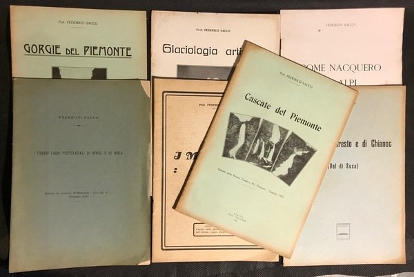 LOTTO di 7 estratti di Federico Sacco: GORGIE DEL PIEMONTE (1925) CASCATE DEL PIEMONTE (1925), GLI ORRIDI DI FORESTO E DI CHIANOC (1926), GLACIOLOGIA ARTISTICA (1927), I GRANDI LAGHI POSTGLACIALI DI RIVOLI E DI IVREA (1928), I MASSI ERRATICI (1929), COME NACQUERO LE ALPI (1930).