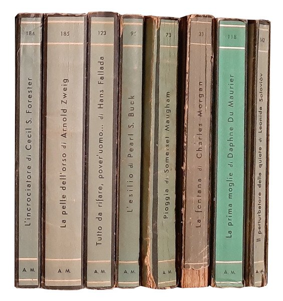 Lotto di 8 romanzi della collezione Medusa, dim. circa 190x120 mm, leg. in brossura editoriale con titoli e decori al piatto e al dorso. Il lotto comprende i seguenti titoli: 1.: Cecil Forester. L'incrociatore. 1947. 2.: Arnold Zweig. La pelle dell'orso. 1947. 3.: Hans Fallada. Tutto da rifare, pover'uomo … 1943. 4.: Pearl Buck. L'esilio. 1942. 5.: Somerset Maugham. Pioggia. 1944. 6.: Charles Morgan. La fontana. 1942. 7.: Daphne Du Maurier. La prima moglie. 1941. 8.: Leonida Soloviov. Il perturbatore della quiete. 1944. Cond.: Esemplari con occasionali segni d'uso alle legature e rare fioriture alle carte, ma in generali molto buoni. Peso: g 2600