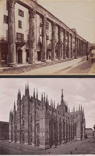 Stampa all'abumina, due portano l'editore 'Brogi', le altre forse sempre Brogi o Alinari. Misure di cm. 25x19,5. (1)-Bella panoramica di Piazza del Duomo e ingresso della Galleria. Persone a passeggio e molti tram. (2)-Veduta prospettica del Duomo, con Vespasiani intorno alla fiancata. (Piccoissimi e narginali strappetti). (3)-Parte posteriore della Cattedrale, alla base un Vespasiano. (4)-Colonne antiche a San Lorenzo. Suggestiva veduta del colonnato con diertro le più recenti abitazioni.