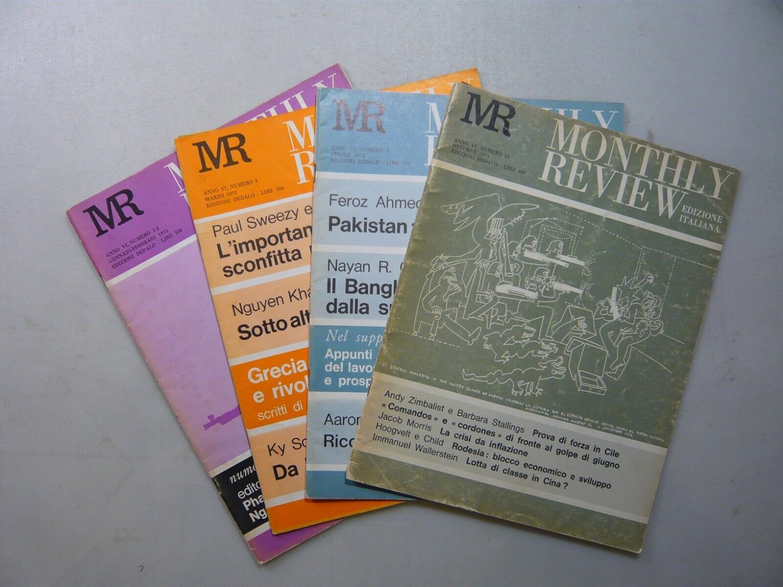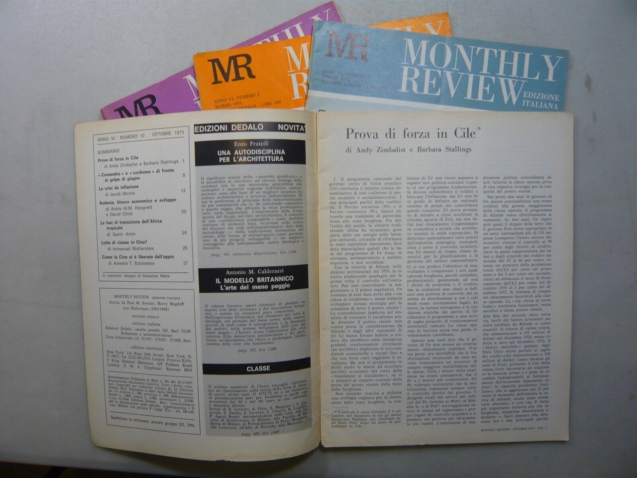 MONTHLY REVIEW Edizione italianaAnno VI, 1973Edizioni Dedalo, rivista diretta da Leo Guberman e Paul M. Sweezy Redazione: Roma, Viale Mazzini 4Spillati, 21,5x28 cm, pp. 35 circa a volume Con tabelle e immagini in bianco e nero.Peso totale: g. 464