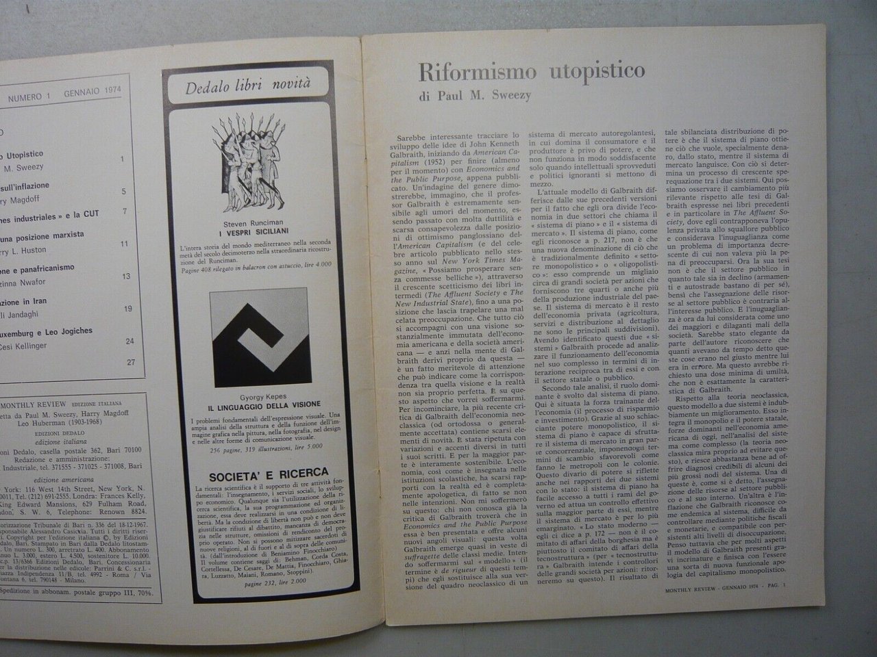 MONTHLY REVIEW Edizione italianaAnno VII, 1974Edizioni Dedalo, rivista diretta da Leo Guberman e Paul M. Sweezy Redazione: Roma, Viale Mazzini 4Spillati, 21,5x28 cm, pp. 35 circa a volume.Con tabelle e immagini in bianco e nero.Peso totale: g. 302