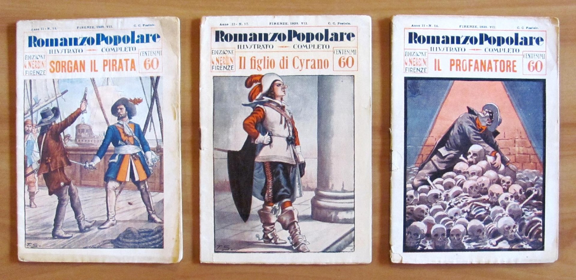 Lotto Anno II - N.15, 17 e 18: N.15 - Giulio D'Annebault - Sorgan il Pirata; N.17 - Emilio Baudoin - Il figlio di Cyrano; N.18 - Mario Piccioli - Il Profanatore. Copertine a colori e 2 illustrazioni in b/n, a piena pagina, n.t. di Tancredi Scarpelli e Giove Toppi. Editore Nerbini - Firenze, 1929. Brossure editoriali con mancanza al margine esterno delle copertine del fascicolo 15 e lievi imperfezioni al dorso del fascicolo 18. Interni freschi e puliti. 14x20,5; pp.32, 32 e 36. Rari e in Buono stato.