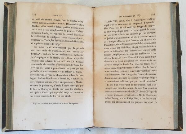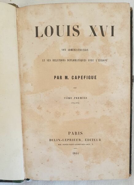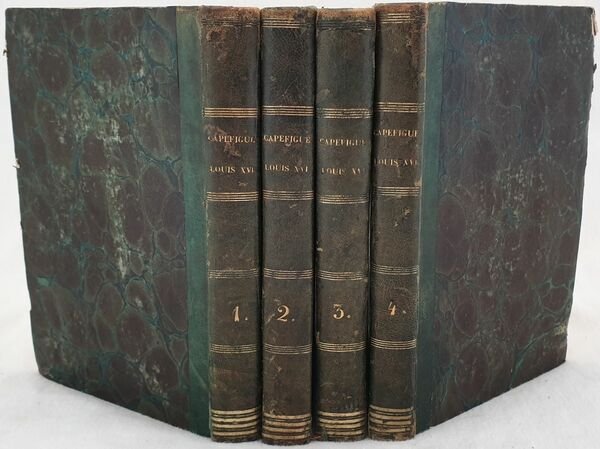 Edizione francese del 1844 di questa opera storica dello storico e biografo francese Jean Baptiste Capefigue (1801-1872). L'opera è composta da quattro tomi ed è completa. L'autore analizza l'amministrazione di Luigi XVI (1754-1793) e le sue relazioni diplomatiche con l'Europa nel periodo 1774-1793 prima e durante la Rivoluzione francese. Ex libris ai contropiatti. In buone condizioni. Coperta in mezza pelle coeva con titolo in oro al dorso in buone condizioni generali con lievi usure marginali. Legatura in buone condizioni. All'interno le pagine si presentano in buone condizioni con fioriture. In 8. Dim. 21,5x14,5 cm. Pp. XII+392, 391, 379+(1), 391+(1)French edition of 1844 of this hystorical work by the french historian and biographer Jean Baptiste Capefigue (1801-1872). The work is made up of four tomes and it is complete The author analyzes the administration of Luigi XVI (1754-1793) and his diplomatic relationships with Europe during the period 1774-1793 before and after French Revolution. Ex libris in the counterplates. In good conditions. Half leather coeval cover with gilted title in the spine in good general conditions lightly worn in the extremities. Binding in good conditions. Pages are in good conditions with foxing. In 8. Dim. 21,5x14,5 cm. Pp. XII+392, 391, 379+(1), 391+(1)