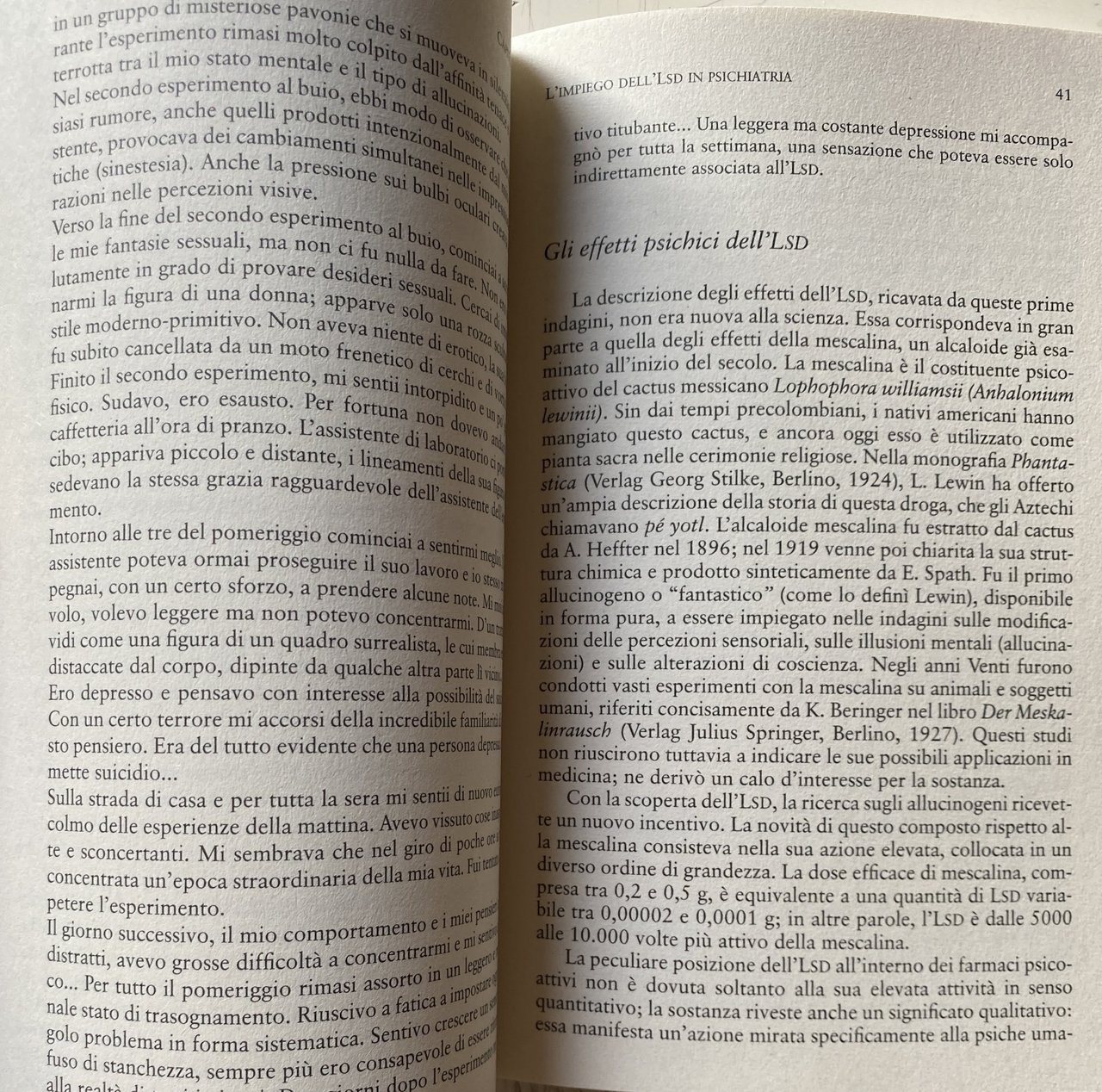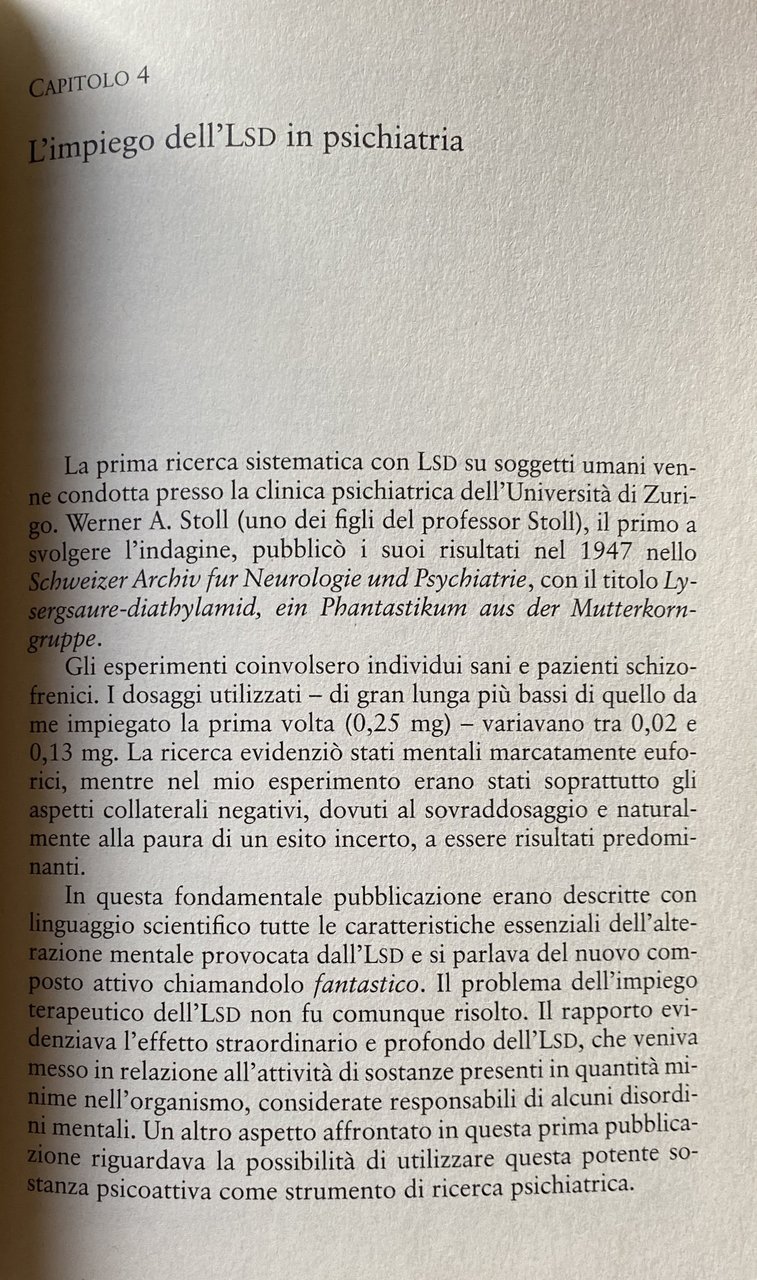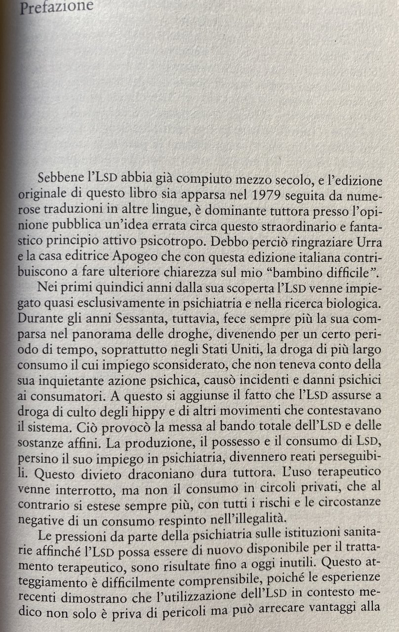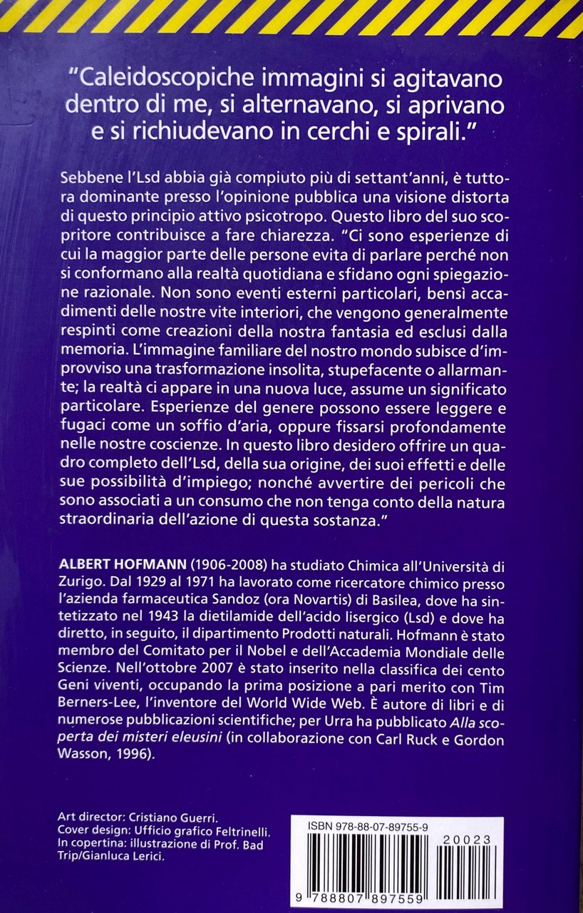 Caleidoscopiche immagini si agitavano dentro di me, si alternavano, si aprivano e si richiudevano in cerchi e spirali. Sebbene l'Lsd abbia già compiuto più di settant'anni, è tuttora dominante presso l'opinione pubblica una visione distorta di questo principio attivo psicotropo. Questo libro del suo scopritore contribuisce a fare chiarezza. Ci sono esperienze di cui la maggior parte delle persone evita di parlare perché non si conformano alla realtà quotidiana e sfidano ogni spiegazione razionale. Non sono eventi esterni particolari, bensì accadimenti delle nostre vite interiori, che vengono generalmente respinti come creazioni della nostra fantasia ed esclusi dalla memoria. L'immagine familiare del nostro mondo subisce d'improvviso una trasformazione insolita, stupefacente o allarmante; la realtà ci appare in una nuova luce, assume un significato particolare. Esperienze del genere possono essere leggere e fugaci come un soffio d'aria, oppure fissarsi profondamente nelle nostre coscienze. In questo libro desidero offrire un quadro completo dell'LSD, della sua origine, dei suoi effetti e delle sue possibilità d'impiego; nonché avvertire dei pericoli che sono associati a un consumo che non tenga conto della natura straordinaria dell'azione di questa sostanza.