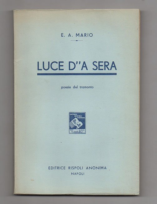 LIBROPrima edizione.CON AUTOGRAFO.Bell’esemplare. Dedica autografa all’occhietto: «al Maggiore Raffaele Contu. Cordialmente E.A. Mario».Raccolta di liriche, già pronte per la stampa nel 1936, che l’autore considerava la ricapitolazione dei motivi ispiratori della sua poetica. Mario è stato uno degli interpreti più importanti della canzone napoletana della prima metà del Novecento, oltre che paroliere di successo: si deve a lui la celebre “Canzone del Piave”, scritta nel 1918 a ridosso della battaglia, per infondere fiducia ai soldati.