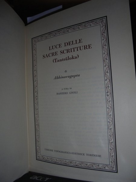 A cura di Raniero Gnoli. Torino, U.T.E.T., 1972. Luce delle sacre scritture (Tantrāloka) di Abhinavagupta. Prima edizione. In-8°, tela edit. con frefi e titolo in oro al dorso, sovracopertina in acetato. 900 pp. con 7 tavole fuori testo. Come nuovo. Neg. lett. mod. mob. C