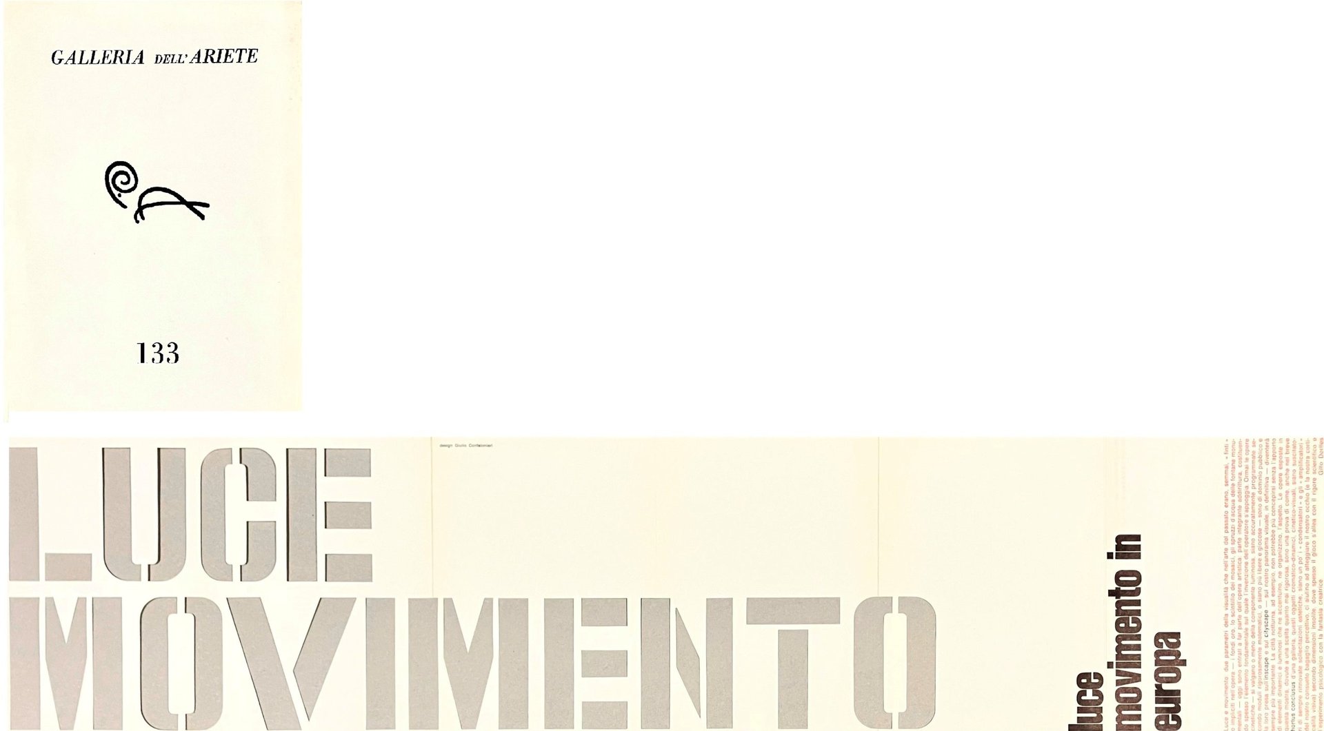 Catalogo numero 133 della Galleria dell'Ariete pubblicato in occasione della mostra inaugurata il 21 novembre 1967, con una splendida idea grafica di Confalonieri che realizza in pieghevole fusatellato. Gli artisti esposti: Calos, Demarco, Duarte, Durante, Garcia Rossi, Schoffer, Vardanega, Boto, Tomasello, Yvaral, Sobrino, Stein, Morellet, Le Parc, Piene, Manuelli, Mari, Marotta, Biasi, Gerstner, Von Graevenitz, Fontana, Munari, Varisco, Boriani, De Vecchi, Colombo, Mack e Vigo.