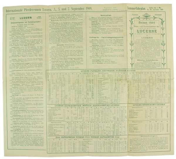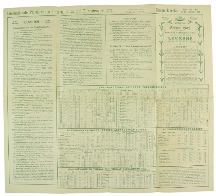 (Codice SV/0032) In 16° 30 pp. Guida in italiano illustrata con 39 foto. Brossura con punti metallici. Allegata carta a colori in tedesco (42,5x37,5 cm), scala 1:100.000. Al verso notizie e orari "Internationale Pfederennen - Luzerm 3., 5.,und 7 Septermber 1909". ~~~ SPEDIZIONE IN ITALIA SEMPRE TRACCIATA