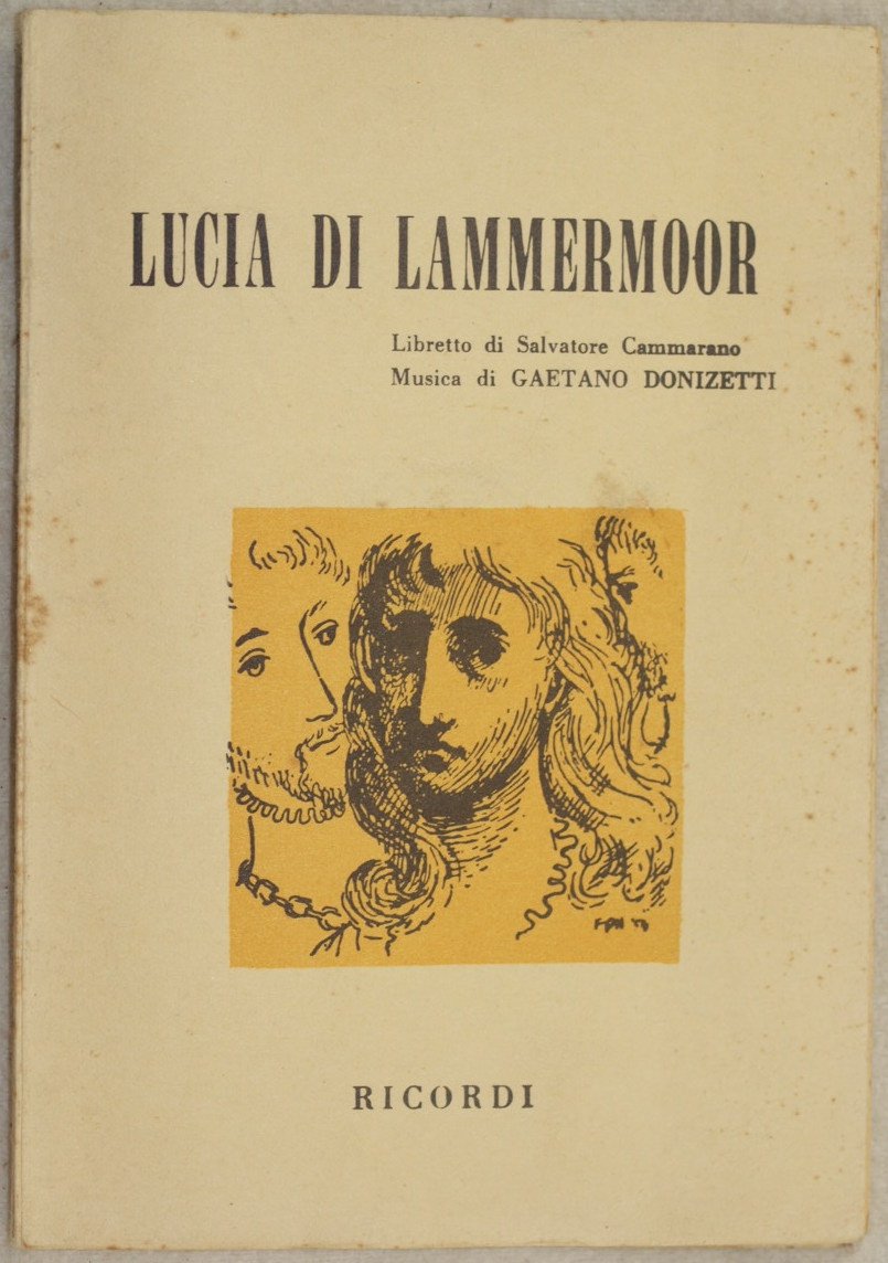 In 16. Dim. 15x10,5 cm. Pp. 48. Bel libretto d'opera del 1972 dell'opera "Lucia di Lammermoor" di Gaetano Donizetti (1797-1848) per il teatro del Leone di Ripatransone (Ascoli Piceno). La prima rappresentazione ebbe luogo al Teatro San Carlo di Napoli il 26 settembre 1835. In buone condizioni. Copertina editoriale in buone condizioni generali con lievi usure ai margini e dorso. Legatura in buone condizioni. All'interno le pagine si presentano in buone condizioni con rare fioriture. Beautiful booklet of 1972 of the work "Lucia di Lammermoor" by Gaetano Donizetti (1797-1848) to be represented in Teatro del Leone in Ripatransone (Ascoli Piceno). The first representation took place in the Teatro San Carlo in Naples the 26th of september 1835. In good conditions. Cover in good general conditions slightly worn in the edges and spine. Binding in good conditions. Inside pages are in good conditions with foxings.