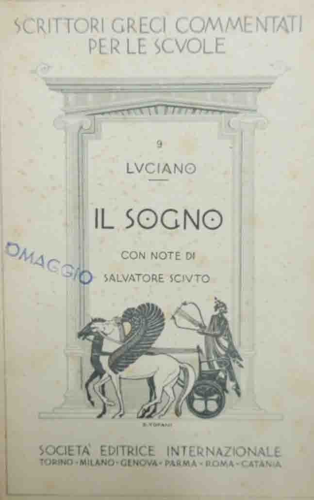 Luciano, Il sogno, con note del dott. Salvatore Sciuto, Società Editrice Internazionale, Torino 1942, pp. 37, cm 21, br. ed. Collana Scrittori greci commentati per le scuole, n. 9. Testo in greco con introduzione e commento in lingua italiana. Timbro Omaggio alla prima di copertina. Piccolo timbro numerico a margine della quarta di copertina. Leggere tracce d’uso, minime fioriture, lieve brunitura della carta, per il resto buona copia.