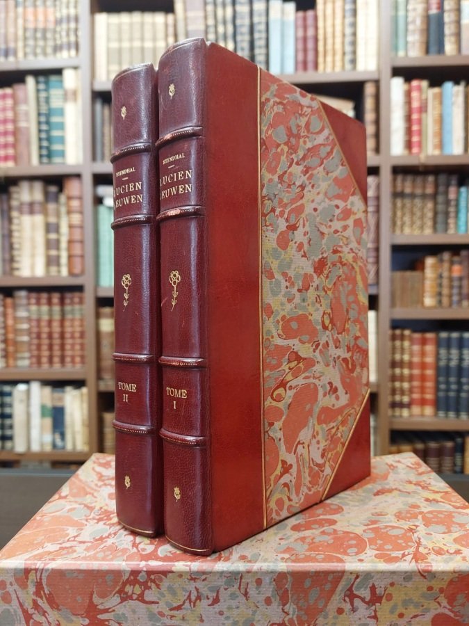 <span style="font-style: normal;">2 volumi in-8° (cm. 22,2), elegante legatura coeva d'amatore in mezza pelle bordeaux ad angoli, dorsi con titolo, filetti puntinati ai nervi in oro e fregi floreali sempre oro, tagli superiori dorati, piatti e risguardi marmorizzati; conservate le brossure originali a stampa con illustrazione in silografia e titoli in rosso; pp. XXXV [1b] 321 [3], 352 [2] in barbe, in ottimo stato. </span><i>Introduction et notes par Henri Martineau.</i> Seconda edizione riveduta e corretta. Tiratura limitata di 6000 esemplari, in nostro n. 3678. Antica firma di possesso alla prima carta bianca di entrambi i tomi. In ottimo stato, conservato in custodia cartonata con la stessa marmorizzatura dei piatti. (NR1)