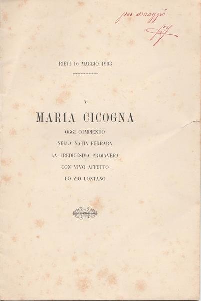 Biglietto di auguri per il 13∞ compleanno 1903copertina morbida editoriale con uno strappo al margine esterno che va ad interessare quasi tutto l'opuscolo frontespizio con fioriture sparse e una dedica a penna rossa al margine superiore interno in buono stato lievi e rare fioriture dedica a Maria cicogna oggi compendio nella nati a Ferrara la tredicesima primavera conviva affetto lo zio lontano in buono stato di conservazione cm 21,5 x 14,5
