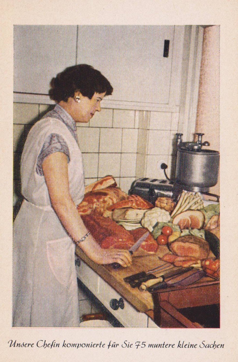 Mit einer farbigen Abbildung: "Unsere Chefin komponierte für Sie 75 muntere kleine Sachen." Auf den nächsten Seiten sind dann diese Sachen verzeichnet und zum Schluß gibt es noch eine Beschreibung der Kneipe "Piet Henningsen".