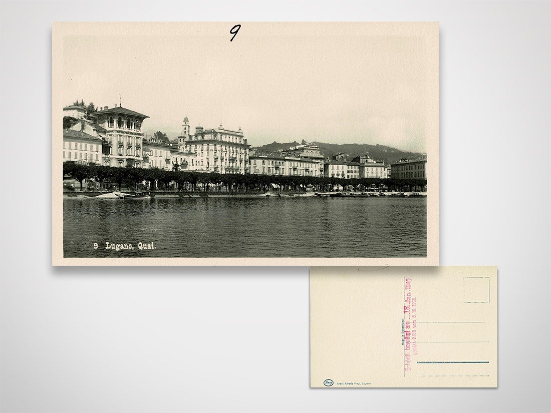 Cartolina Lugano il Quai, timbro in originale di approvazione della Confederazione, non viaggiata Dimensioni: 9 x 14 cm