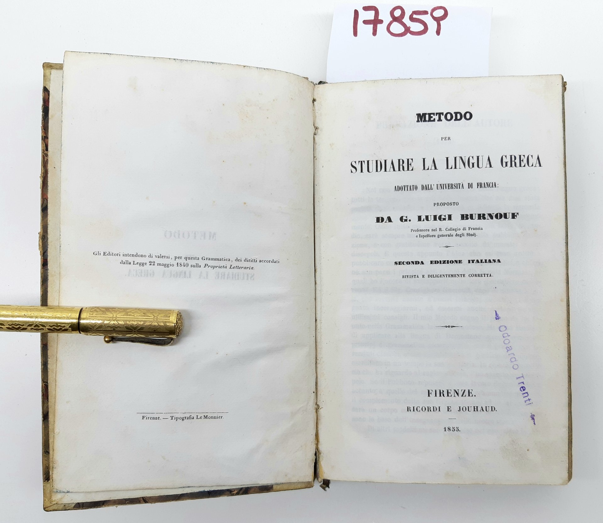 Luigi Burnouf Metodo per studiare la lingua greca 2° ed. Ricordi e Jouhaud 1855