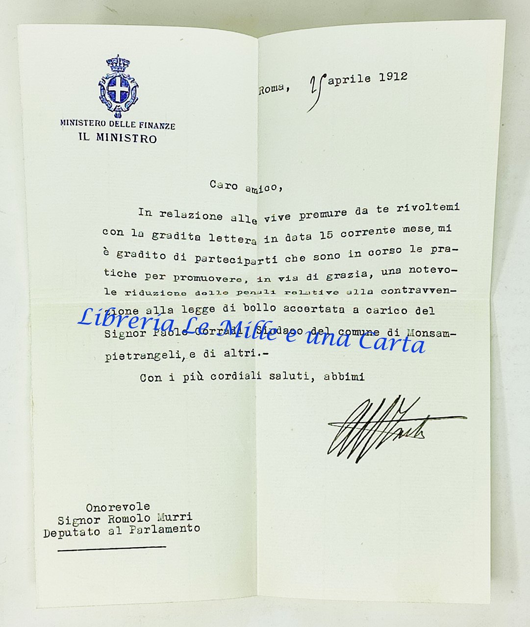 Autografo originale di Luigi Facta su foglio intestato del 'Ministero delle Finanze', datato 25 aprile 1912.; Il foglio è indirizzato all'Onorevole Romolo Murri (intestazione stampata al fondo del foglio).; Dimensioni del foglio: 17,5 x 22 cm circa.; Foglio stampato su un solo lato (1 pagina).; Stato di conservazione: Il foglio è stato conservato piegato in quattro parti e, di conseguenza, riporta le quattro linee di piegatura ma, nel complesso, ottimamente conservato.; Si vedano le fotografie che fanno parte integrante della descrizione.; AUTOGRAFO MANOSCRITTO, A PENNA.; Testo della lettera dattiloscritto.; Carta filigranata.; DA COLLEZIONE.