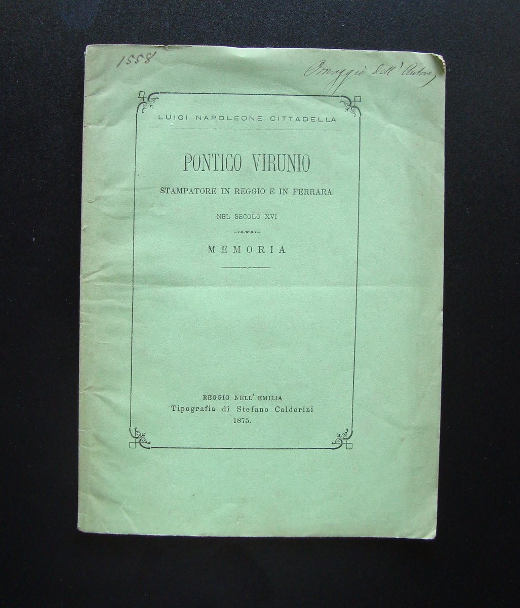 Luigi Napoleone Cittadella, PONTICO VIRUNIO Stampatore in Reggio e Ferrara nel secolo XVI MEMORIA Tip. di Stefano Calderini, Reggio Emilia, 1875, cm 20,5x15, pp. 24; brossura ed. Omaggio dell'autore " scritto a penna alla br.ant. Condizioni di conservazione. Raro esemplare in buono stato con leggere tracce d'uso e del tempo, brossure con leggere bruniture ai margini e al dorso; br.ant. con numerazione al margine sup. Raro OPEB.3414 BLU "