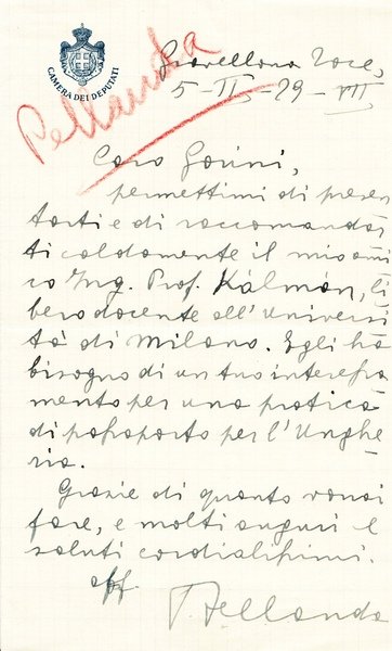 lettera manoscritta e firmata di Luigi Pellanda di 1 facciata su carta intestata "Camera dei Deputati" datata Gravellona Toce, 5 Febbraio 1929 e spedita all'Onorevole Gorini; buon es.