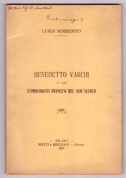 *LUIGI SORRENTO. Benedetto Varchi e gli etimologisti francesi del suo secolo. 1921