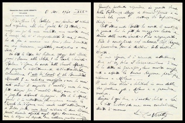 lettera manoscritta e firmata di Luigi Veratti di 2 facciate su carta intestata personale datata 9 Novembre 1940; buon es.