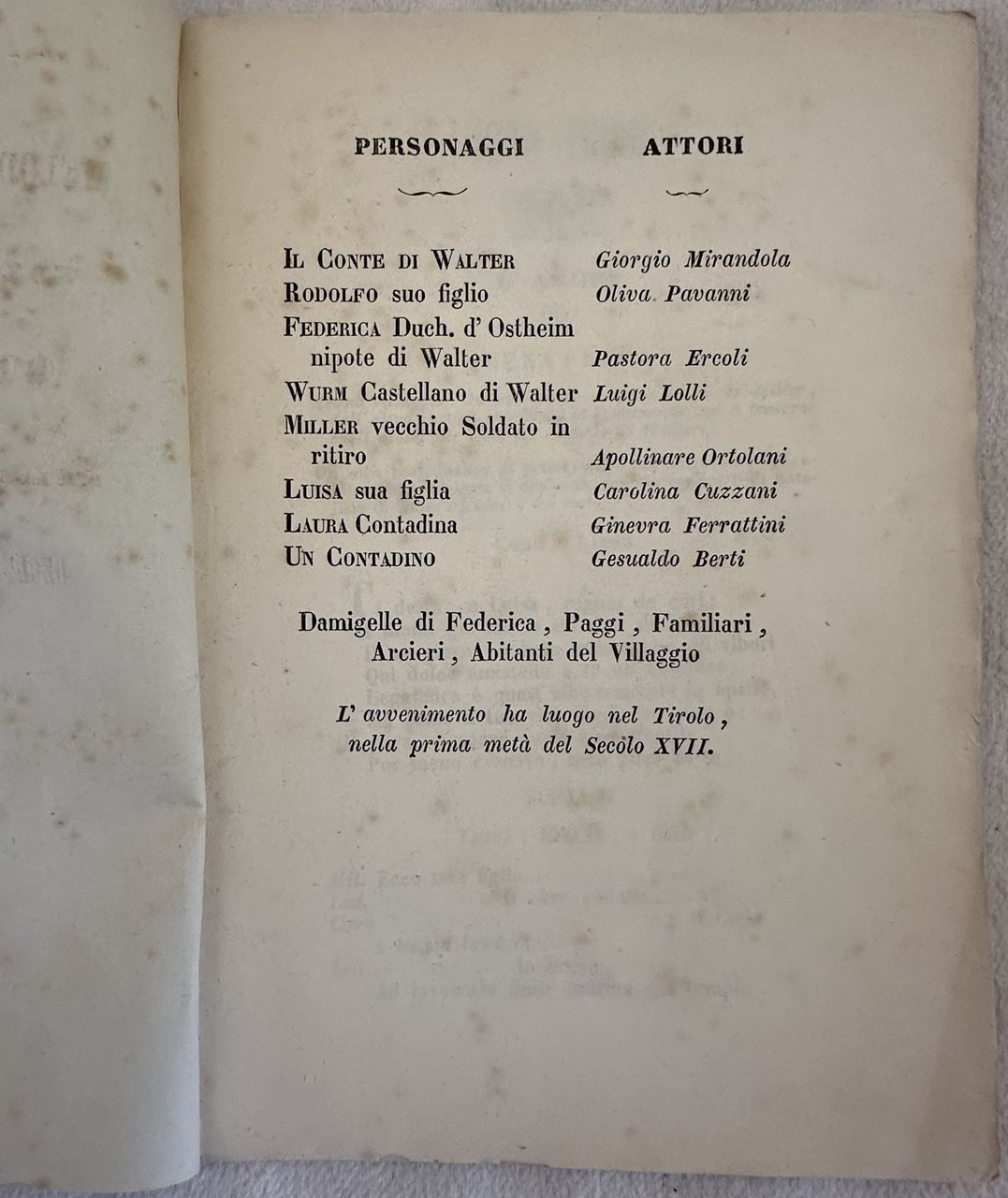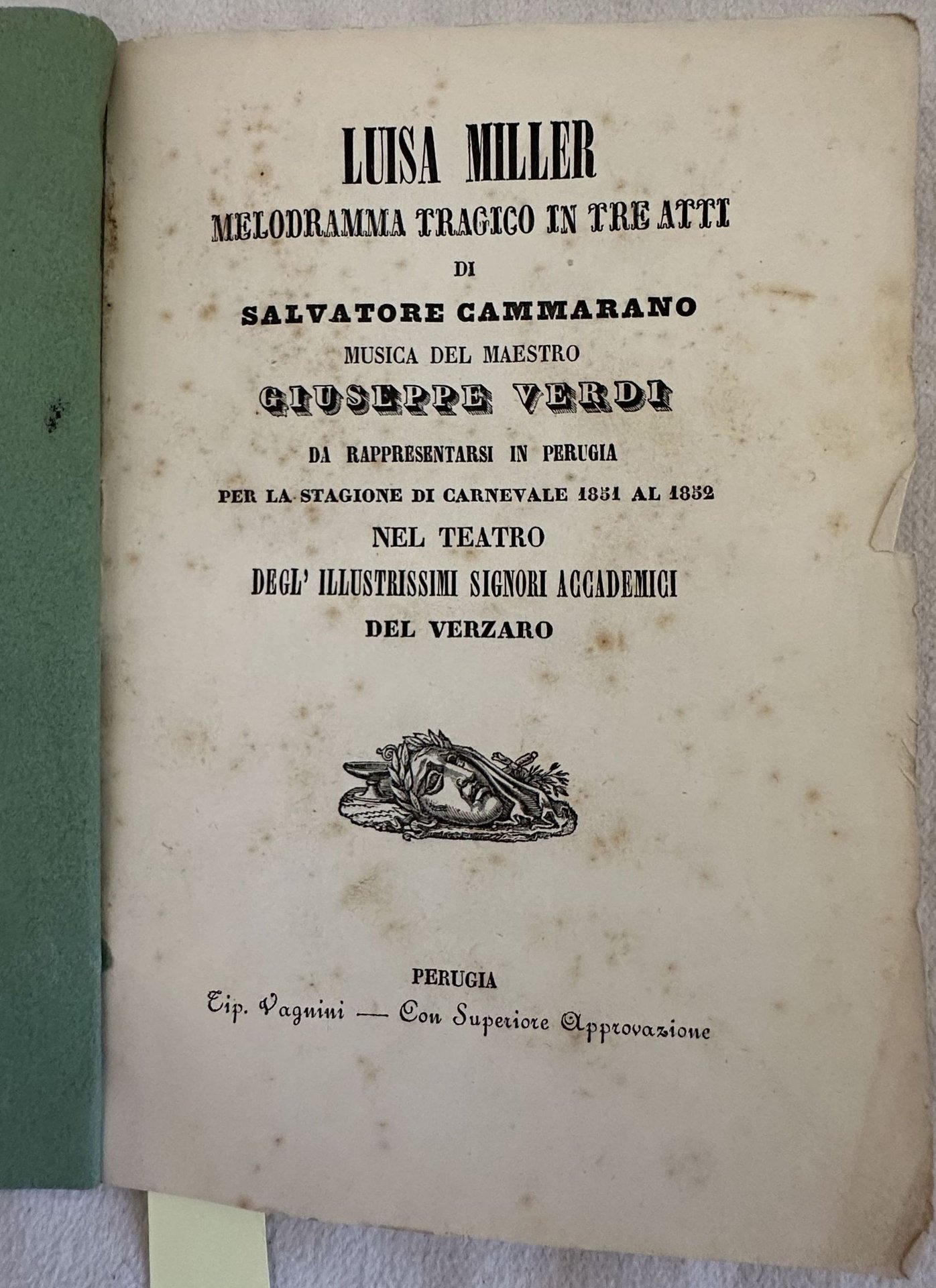 In 4. Formato cm. 34,5x26. Pp. 8. Edizione Ricordi del maggio 1926 di questo spartito per pianoforte del pezzo "Quando le sere al placido" tratto dall'aria finale II del "Luisa Miller" di Giuseppe Verdi. Timbro a secco datato maggio 1926. In buone condizioni con rare fioriture. Copertina assente. Legatura in buone condizioni. Pagine in buone condizioni con rare fioriture. Ricordi edition of may 1926 of this musical score of the piece "Quando le sere al placido" taken from aria finale II of "Luisa Miller" by Giuseppe Verdi. Embossed stamp dated may 1926. In good conditions with occasional foxings. Cover is missing. Binding in good conditions. Pages in good conditions with occasional foxings.