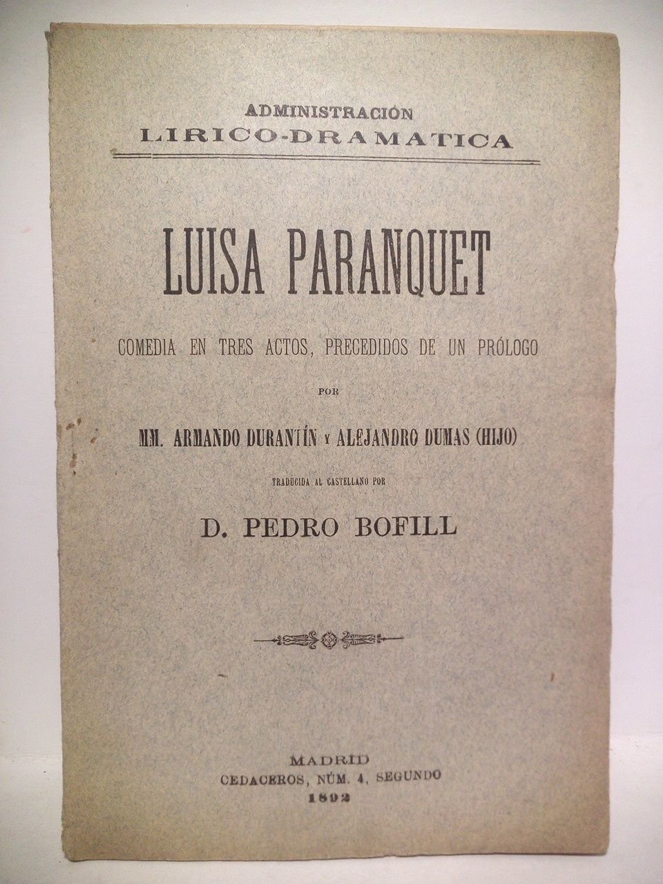 Luisa Paranquet. (Comedia en tres actos, precedidos de un prólogo. Estrenada en el Teatro de la Princesa, de Madrid, el día 19 de Octubre de 1892) / Traducida el castellano, por Don Pedro Bofill
