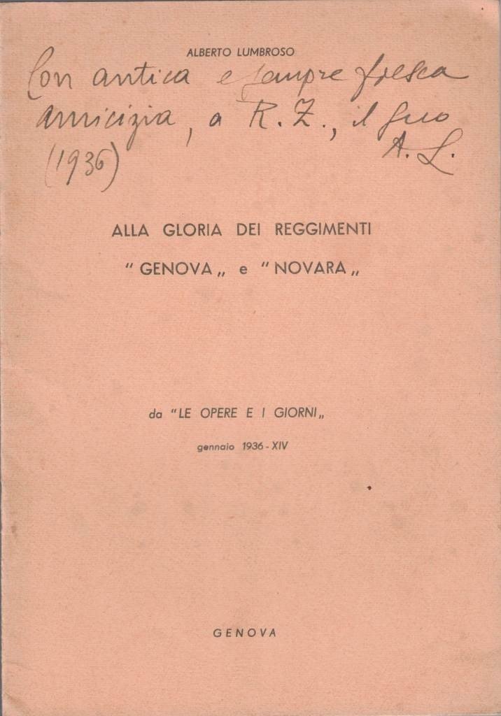 Alberto Lumbroso, Alla gloria dei reggimenti Genova e Novara, s.n., Genova 1936 (stampa Stab. Grafico Gnecco e C., Genova), pp. 9, cm 24, rilegatura a punto metallico. Estratto da Le opere e i giorni, gennaio 1936 XIV. Dedica manoscritta dell’autore in testa alla prima di copertina. Lievi tracce d’uso, minime fioriture, per il resto ben conservato.