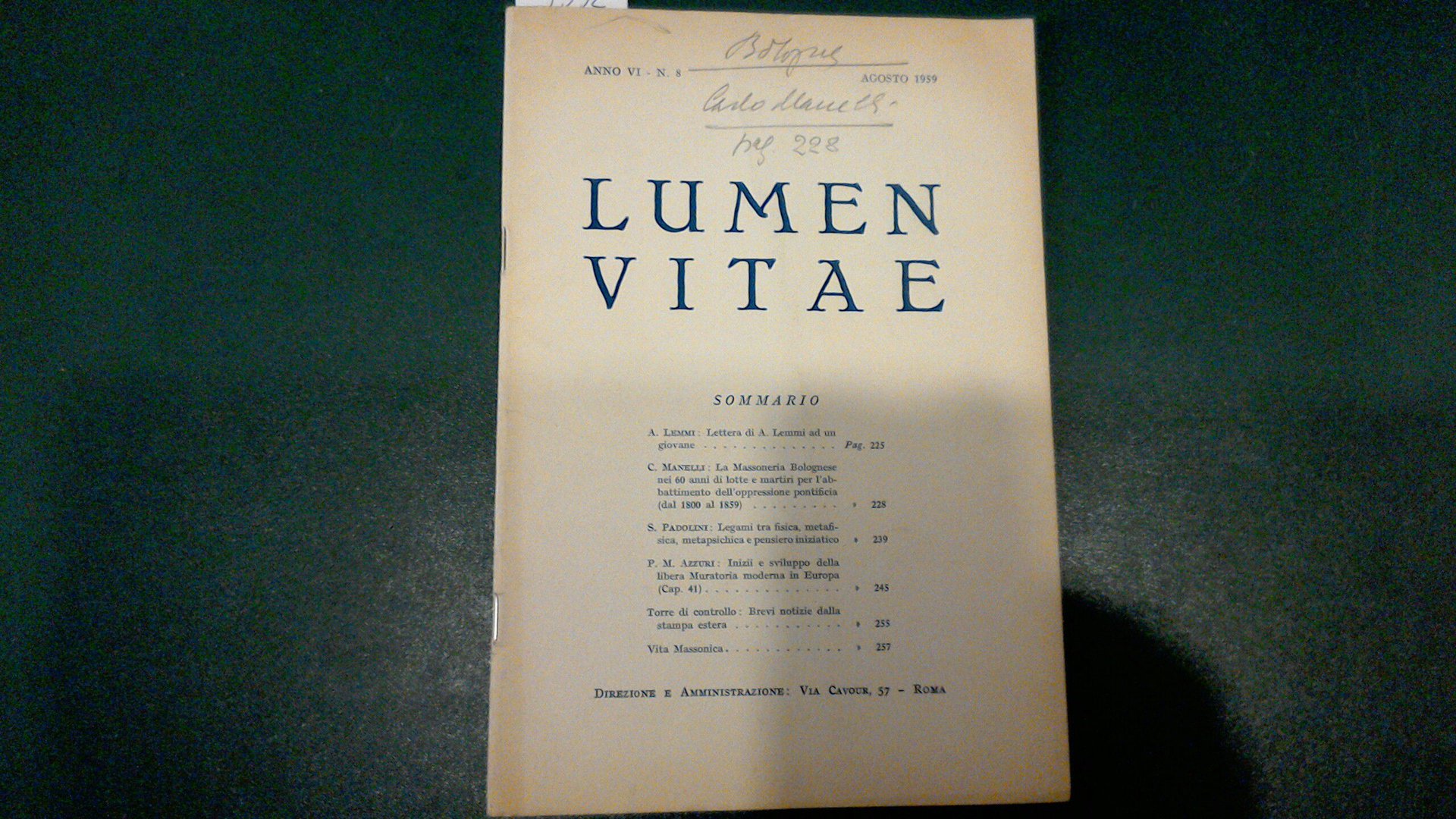Rivista della Massoneria. Tra gli articoli: La Massoneria bolognese nei 60 anni di lotte e martiri per l'abbattimento dell'oppressione pontificia ( 1800-1859 ); Legami tra fisica, metafisica, metapsichica e pensiero iniziatico; Inizii e sviluppo della libera Muratoria moderna in Europa.