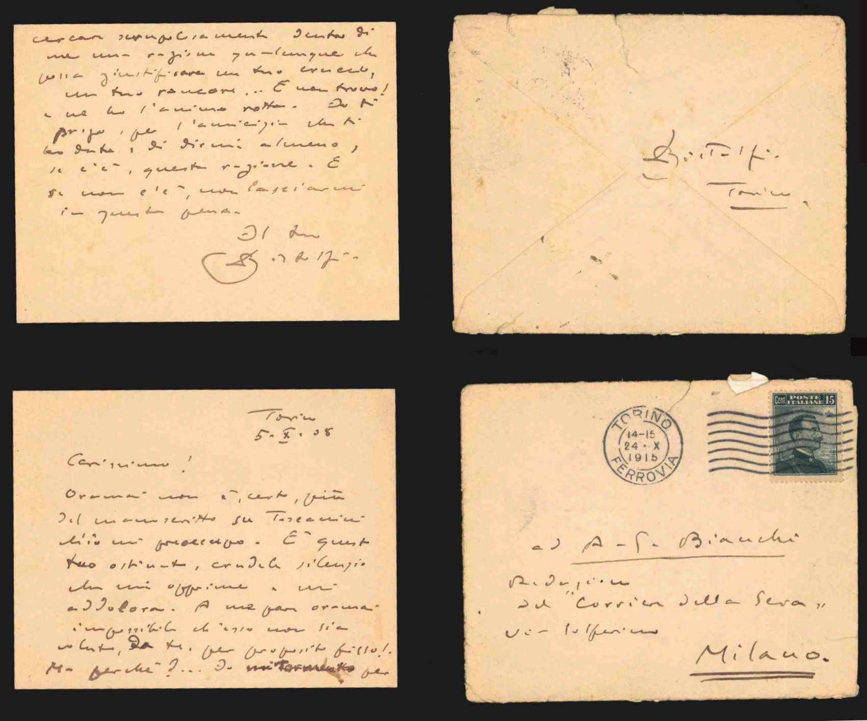 AUTOGRAFOBusta conservata. “Oramai non è, certo, più del manoscritto su Toscanini ch’io mi preoccupo. E’ questo tuo ostinato, crudele silenzio che mi opprime e mi addolora [.]. Ma perché? [.]”.