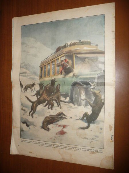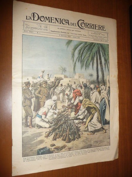 DESCRIZIONE: Domenica del Corriere, Milano, Anno XXXII n. 1 (5 Gennaio 1930-VIII). COPERTINA: "Con l'avanzata Italiana verso il Fezzan, a circa 600 chilometri nell'interno della Libia, sono stati rioccupati alcuni paesi che dal 1915 erano ricaduti sotto il dominio di capi ribelli, ora fuggiti o debellati. La colonna di sahariani del Duca delle Puglie, in cooperazione con le truppe del generale Graziani, ha occupato, fra l'altro, la fresca oasi di Brak, i cui abitanti si sono sottomessi, consegnando le armi." (dis. A. Beltrame). RETRO: "L'autovettura che fa servizio postale fra Moliterno e Montesano (Potenza) è stata assalita da un branco di lupi mentre procedeva lentamente a causa dell'abbondante neve caduta. Il conducente, che era armato di fucile, ha ucciso un lupo e ne ha feriti due riuscendo a mettere in fuga gli altri." (dis. A. Beltrame). La Domenica del Corriere è stato un popolare settimanale italiano fondato a Milano nel 1899 e chiuso nel 1989. Apparve per la prima volta nelle edicole l'8 gennaio 1899 come supplemento illustrato del Corriere della Sera. Stampata in grande formato (sul modello del domenicale La Tribuna illustrata), aveva 12 pagine e veniva distribuita gratis agli abbonati del Corriere, oppure si poteva acquistare in edicola per 10 centesimi. La prima e ultima di copertina erano sempre disegnate. Il Corriere si avvaleva di un giovane disegnatore, Achille Beltrame, allora sconosciuto, a cui veniva affidato in ogni numero il compito di rendere con la sua tavola il fatto più interessante della settimana. Dopo la sua morte nel 1945, fu sostituito da Walter Molino che, come il suo predecessore, firmò memorabili copertine. A differenza dei settimanali dell'epoca, la Domenica del Corriere diede ampio spazio alle fotografie e ai disegni, e questo fu uno dei motivi del suo successo. CONDIZIONI: Buone. Con spille e sovraccoperta, strappetti e piccole macchie. PESO / WEIGHT: 100 gr. without package