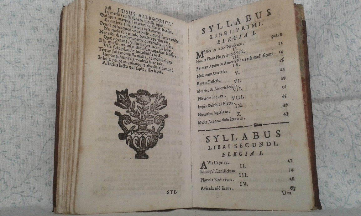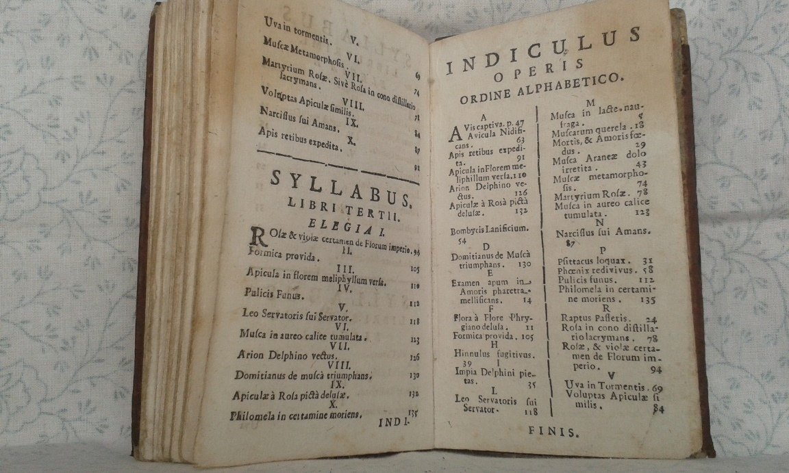 Volume in 12 legato in pelle, piatti inquadrati da duplice filetto in oro con fioroni agli angoli, dorso ornato, mancanza della sguardia, frontespizio con marca dello stampatore, 138 pp., 2 carte finali d'indici. Un insieme di 'divertissements' poetici, dal 'MUSCA IN LACTE NAUFRAGA' al 'RAPTUS PASSERIS' o al 'BOMBYCIS LANIFICIUM' al 'PULICIS FUNUS' eccetera. Piacevolissimo da leggere, questo insieme di giochi poetici quanto mai scorrevole e piano. In buone condizioni, lamenta soprattutto alle prime pagine segni di gore che, nel margine inferiore, toccano qualche riga di testo. Rare mende d'uso, piacevole e poco comune.