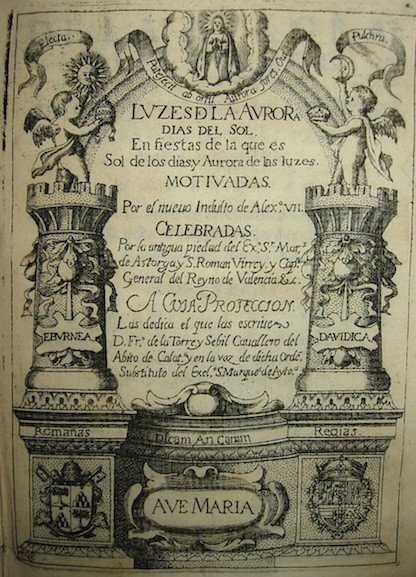Luzes de la Aurora, Dias del Sol, en fiestas de la que es Sol de los Dias, y Aurora de las Luzes, Maria Santissima. Motivadas por el nuevo Indulto de Alexandro Septimo, que concede octava con precepto de rezo de la Inmaculada Concepcion.