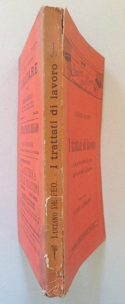 Luciano De Feo, I trattati di lavoro e la protezione dei nostri lavoranti all'estero. Prefazione di Luigi Luzzatti Fratelli Treves Editori, Milano 1916, cm 19x12.5, pp. 144, prefazione di Luigi Luzzatti, br. ed. Condizioni di conservazione Esemplare in buono stato con leggere tracce d'uso e del tempo; brossura editoriale con minimi strappetti al dorso, piatti con qualche macchietta. SETT120.L11534 MT