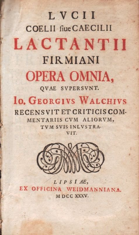 In-8° (cm 17,5 x 10), legatura neoclassica in mezza pelle con tit. in oro su tassello, rotelle e urnette in oro al dorso liscio; pp. (16)-64-1235(29). Frontespizio stampato in rosso e nero; belle testatine, capilettera e finalini xilografici. Esemplare assai brunito; altrimenti in buono stato di conservazione. Il volume contiene le Opere superstiti di Lattanzio, segnatamente il Divinae institutiones, il De Mortibus Persecutorum, il De Ira Dei, il De Opificio Dei, l'Epitome Institutionum Divinarum, etc. Johann Georg WALCH (Meiningen, 1693 - Jena, 1775) è stato un teologo evangelico-luterano tedesco.
