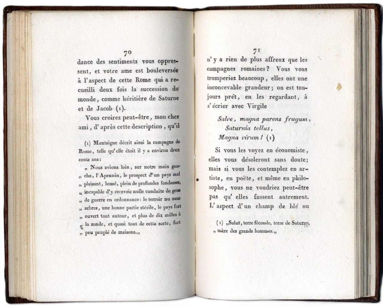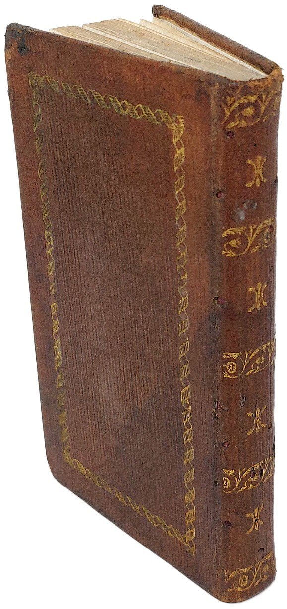 >in-12, pp. (4), 122, (2), legatura coeva in pelle con bordura oro sui piatti e fregi al dorso (con alcuni forellini di tarlo). Dedica dello stampatore alla nobildonna ''Lucrèce Ripanti née Princesse Rospigliosi''. Lo scritto di Barthélemy risale al 1755, la lunga lettera di Chateaubriand a Mad. De F. porta la data 1 gennaio 1804. Graziosa edizione e bell'esemplare su carta forte. Olschki, Choix XI, 16412.