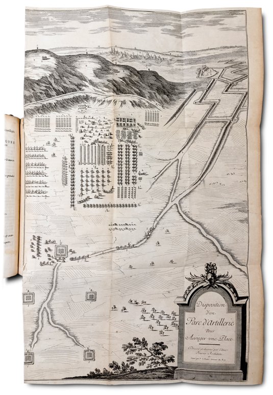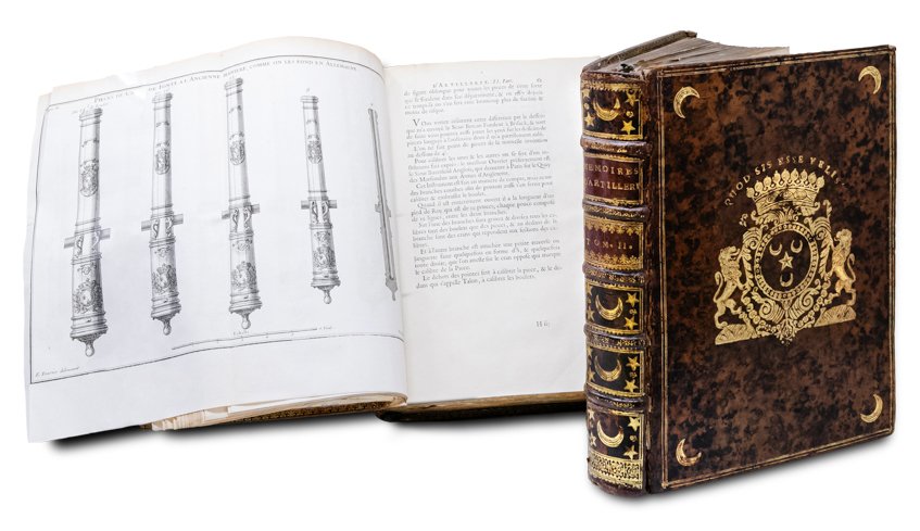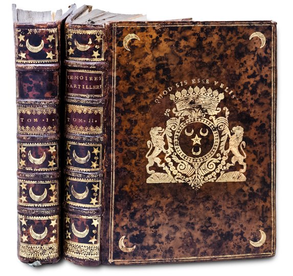 >2 vol. in-4, (245x180 mm), pp. (20), 348, (2); (8), 386, (2), belle legature dell'epoca in piena pelle moucheté con triplice filettatura oro ai piatti, quattro crescenti lunari angolari e al centro armi araldiche sorrette da due leoni rampanti e sormontate dal motto “Quod sis esse velis”; le armi presentano tre crescenti disposto a triangolo con una stella al centro e un collare, forse della Toison d'Or, che pende. Sono identificabili con quelle di Camus de Pontcarré de Viarmes (1702-1775), fu come suo fratello, un grande collezionista e mercante parigino (Catalogue de la bibliothèque de feu M. Camus de Pontcarré de Viarmes. Paris, Knapen, 1775). Prevosto dei mercanti ebbe il merito nel 1763 di inaugurare a Lamoignon la prima biblioteca parigina aperta al pubblico. Il primo volume comprende quattro testatine, 107 tavole f.t. (di cui 11 ripiegate o doppie), 6 tavole numeriche f.t.; il secondo volume comprende tre testatine, 68 tavole, di cui 14 ripiegate, 2 tavole numeriche f.t. Prima edizione di opera fondamentale che servì a diverse generazioni di ufficiali di artiglieria, tra cui il giovane Napoleone. Opera pubblicata diverse volte (1702, 1741, 1745), fu addirittura tradotta in russo (1732-33) e in parte in inglese. Tra gli argomenti citiamo: la fabbricazione di cannoni di varie dimensioni e tipi, la produzione di polvere da sparo e palle di cannone, tecniche di montaggio di cannoni su carrozze e navi, organizzazione e distribuzione di materiale adeguate per le batterie, posizionamento corretto delle pistole, tattica, attacco, difesa… Ottimo esemplare. Guigard, Nouvel Armorial du Bibliophile, II, p. 110.